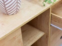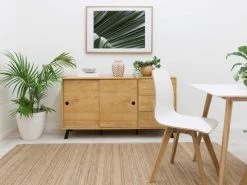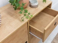 Display your décor in style with the Kirra Buffet. Fusing practical, modern design with a focus on raw, natural finishes, this cabinet is perfect for all your storage and styling needs. The spacious sliding cupboards and set of three drawers provide ample storage space. Suitable for the living room, hallway, dining room or bedroom, this unit maximise the storage while adding the perfect spot to style candles and plants on top.