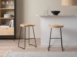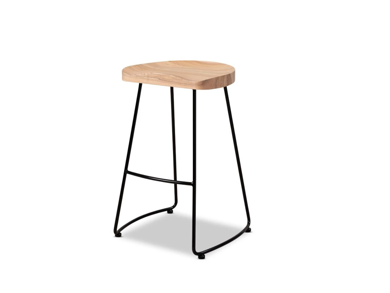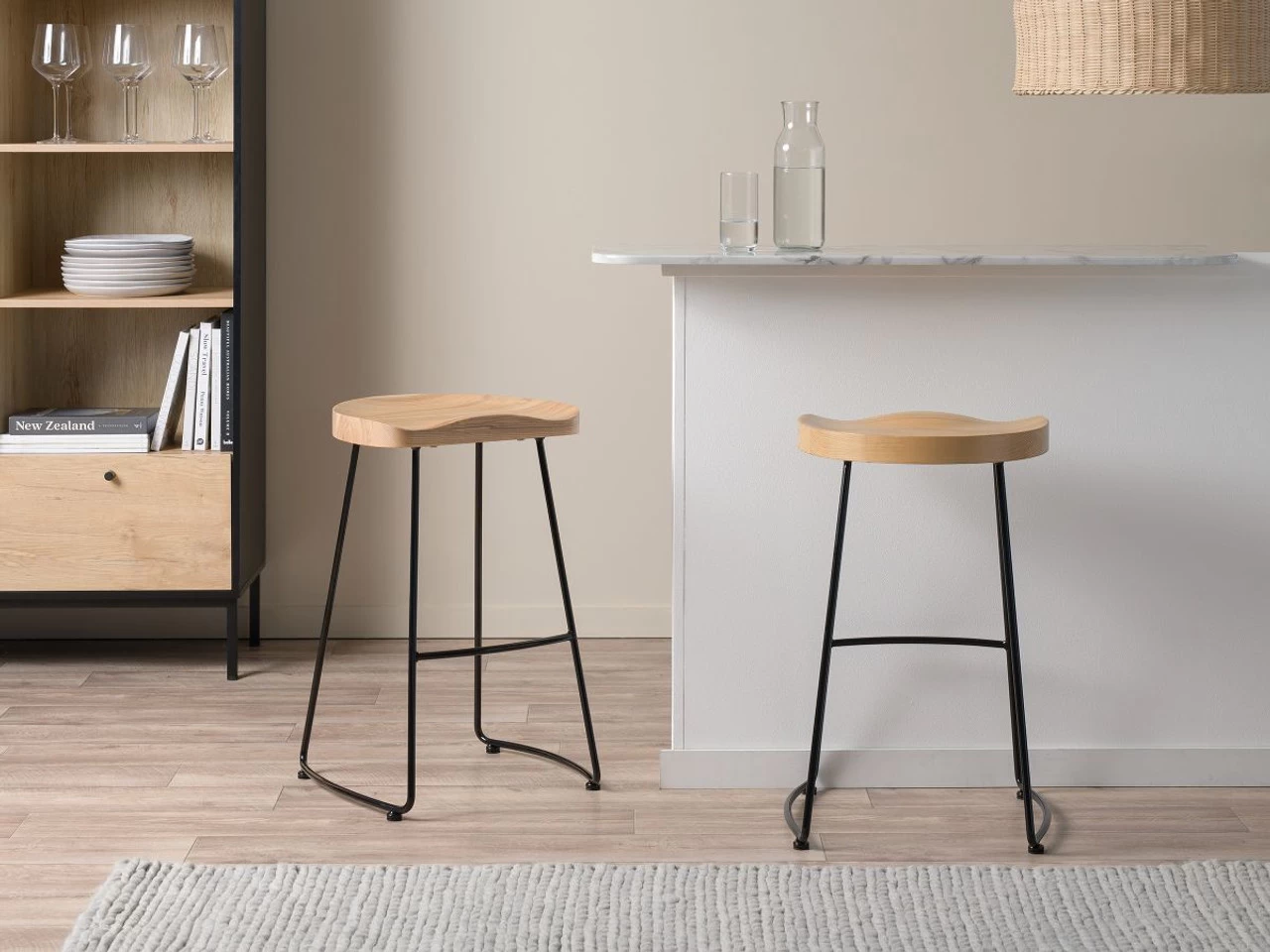 The Levi Bar Stool โ Black is a black bar stool with a wooden seat. Ideal for use in both a commercial space or at home, this stool is perfect for a kitchen island, breakfast bar or other entertainment space. Measuring at 65cm high (and without a backrest to get in the way), this bar stool is the perfect size to tuck under a bench when not in use.