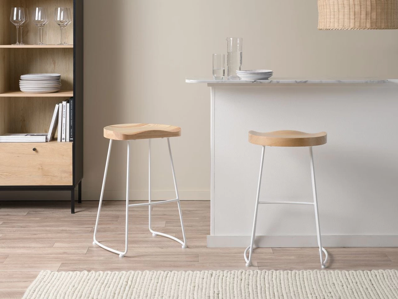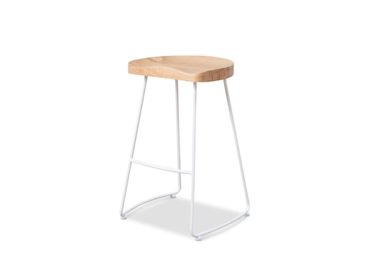 The Levi Bar Stool โ White is a white bar stool with a wooden seat. Ideal for use in both a commercial space or at home, this stool is perfect for a kitchen island, breakfast bar or other entertainment space. Measuring at 65cm high (and without a backrest to get in the way), this bar stool is the perfect size to tuck under a bench when not in use.