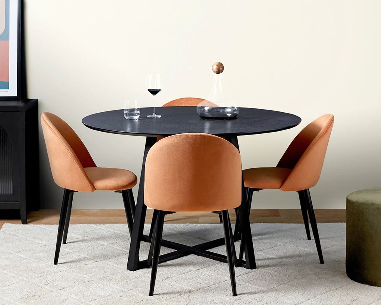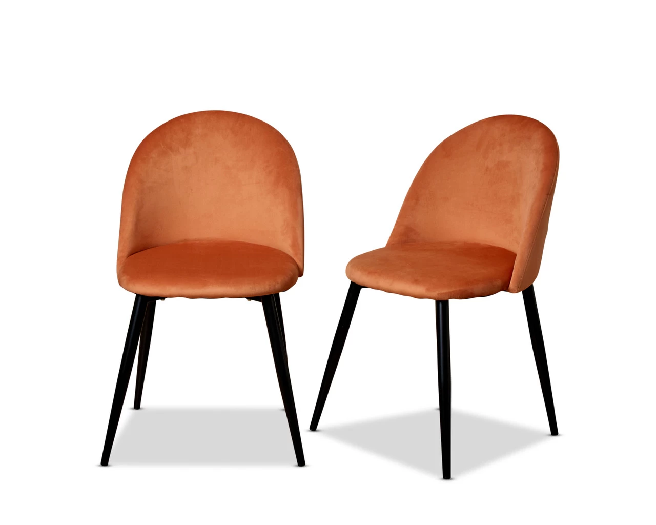 The Londyn Dining Chairs Set of 2 – Rust add pure luxury to your dining room. The curved back is on-trend and oh-so-chic, giving these chairs an eye-catching style, you’ll love sinking into. Upholstered with a rich velvet fabric that’s so soft to the touch, they shine in a stunning, warm rust colour. Embracing earthy tones and luxe style, it’s a stunning combination with the black legs and a great way to add statement colour to your dining room table. Super comfortable, they’re perfect for everyday dining and leisurely dinner parties but could also make fabulous accent chairs in your living room, bedroom, or office.
