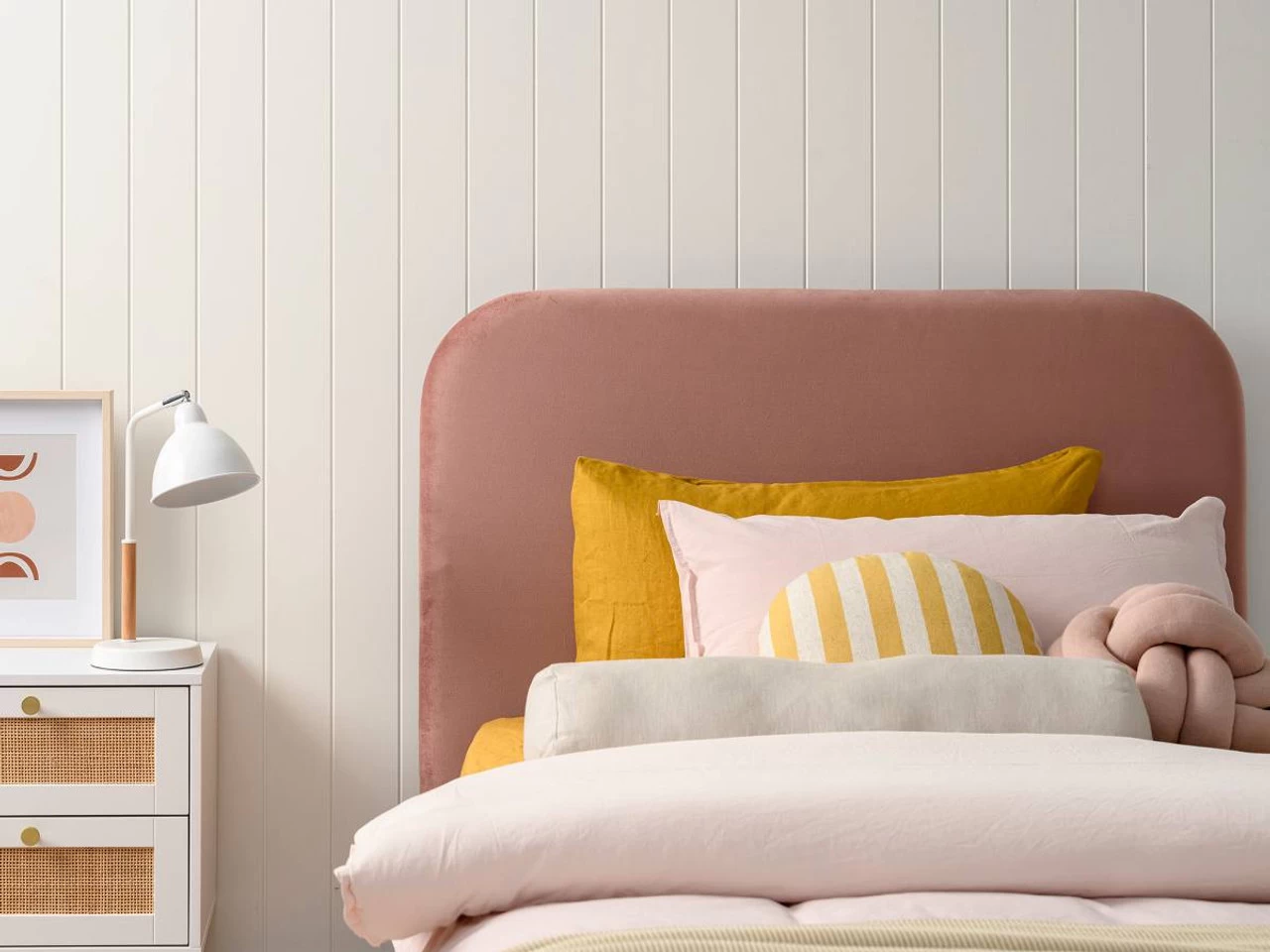 The Luka Velvet King Single Bed – Blush Pink is an easy way to create a stunning kid’s bedroom retreat. With a luxe, modern style, this king single bed is an ideal size for older children and has a chic vibe that any child will adore. Featuring a padded, rectangular headboard with curved corners, this is a great spot for kids to casual lounge and use as backing when reading before bed or during their free time. This headboard also creates a feature against the wall and rounds out the look when styled with linens, quilts, and cushions. This velvet king single bed for kids has a strong, plywood slat base for a comfortable and secure night’s sleep. We love the warm, blush pink colourway and the smooth feel and lovely sheen of the velvet fabric that adds luxe style to a kid’s bedroom and will be suitable for them even as they grow older.