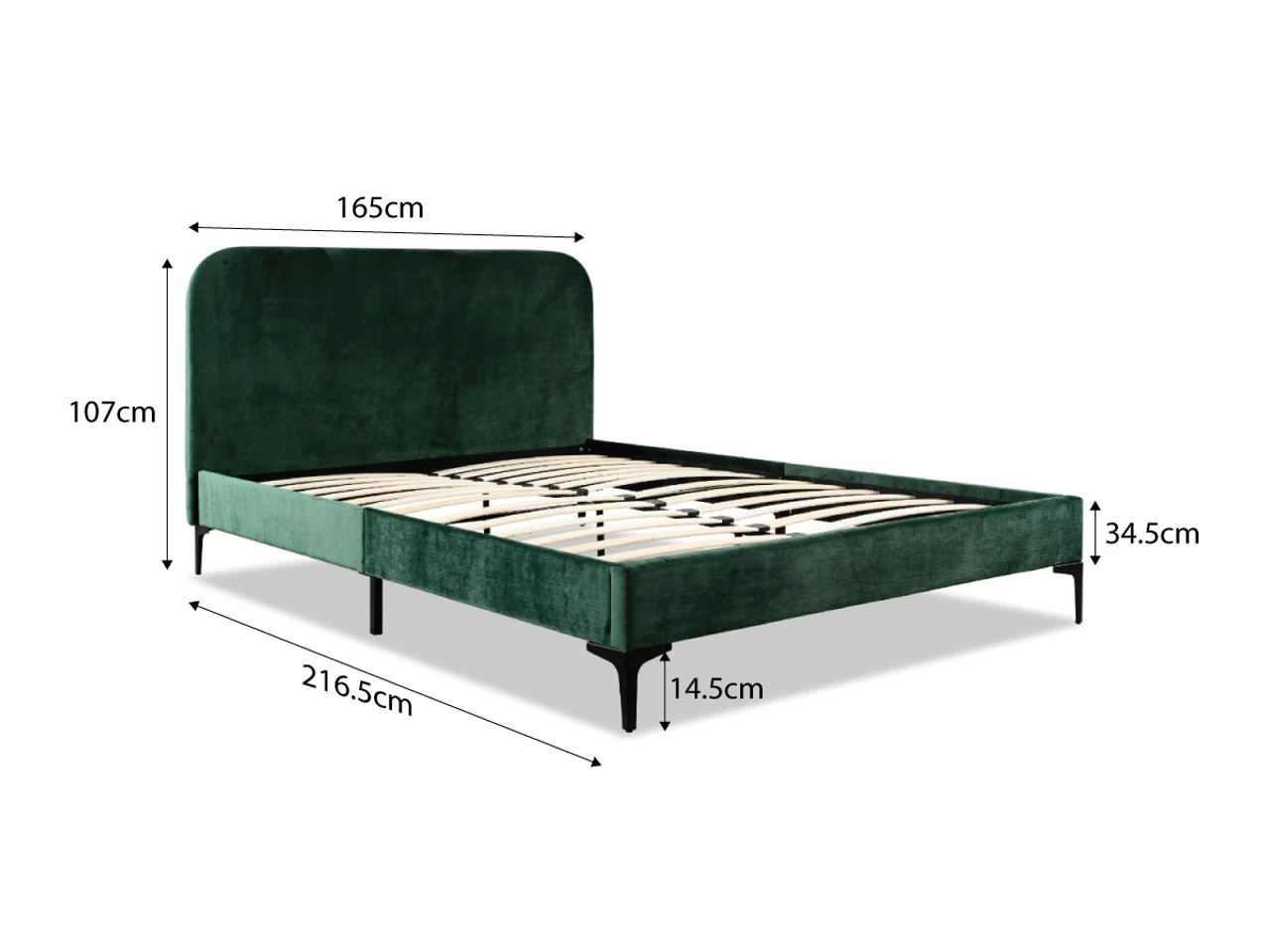 The Luka Velvet Queen Bed – Forest Green is a statement queen bed perfect for any master bedroom, guest bedroom, or teenagers/child’s bedroom. This upholstered queen bed frame has luxe, sophisticated style and features a rectangular headboard with curved corners which you’ll love as the perfect backing for casual lounging and late-night reading. A dream to sleep in, this velvet queen has a strong, plywood slat base for a comfortable night’s sleep and is supported by gorgeously shaped, metal legs for a sturdy design. Featuring a deep, forest green colourway in the smooth sheen of the velvet fabric, this colour is rich and sophisticated. Use as a luxe backdrop for bed linens, quilts, and cushions for seasonal styling.