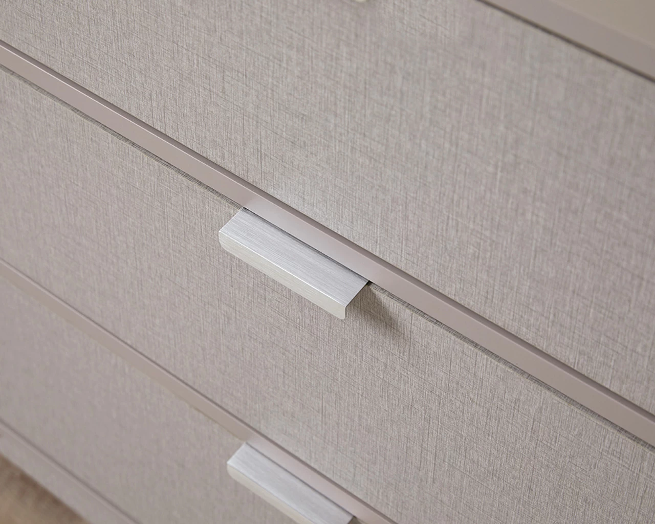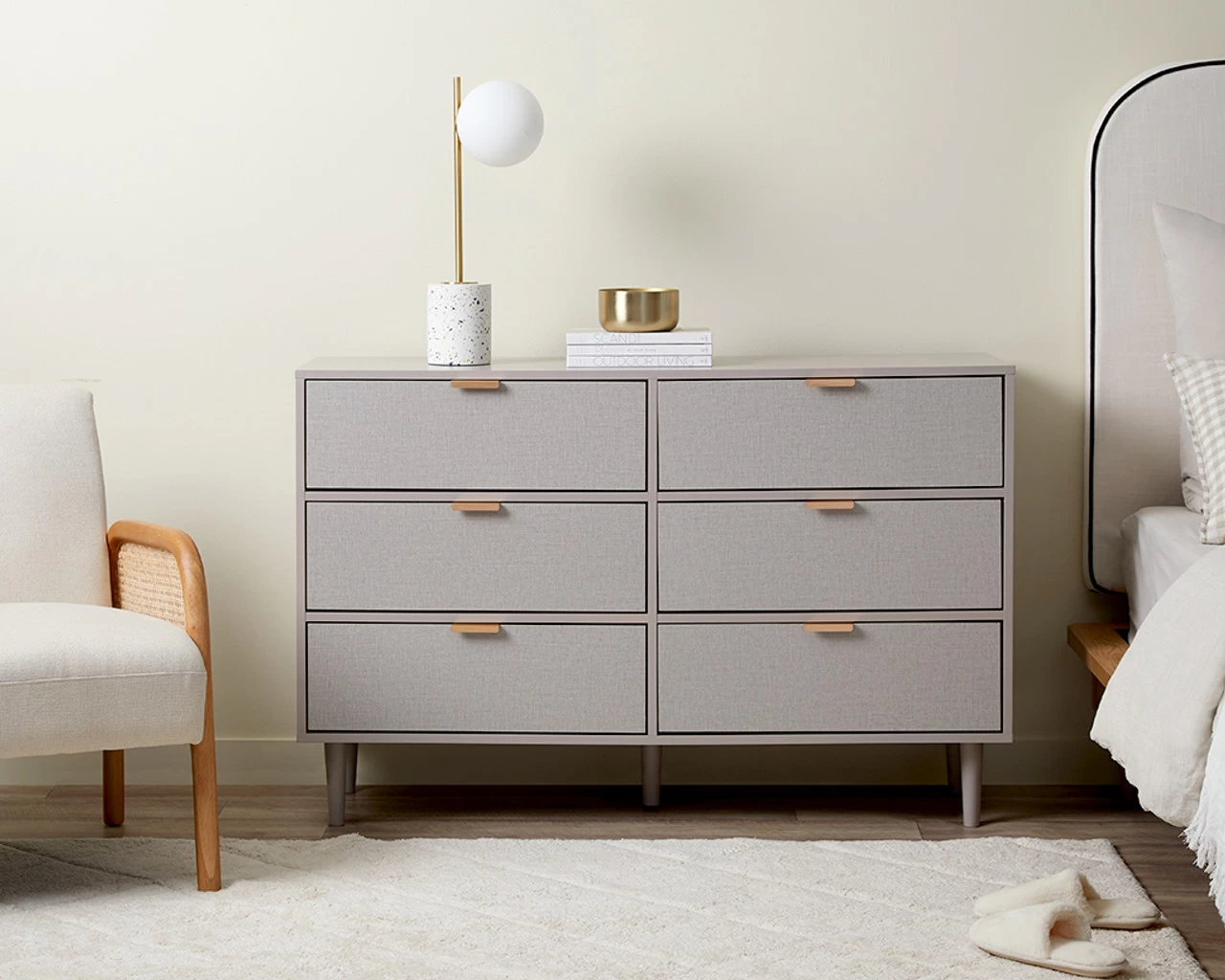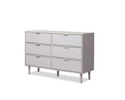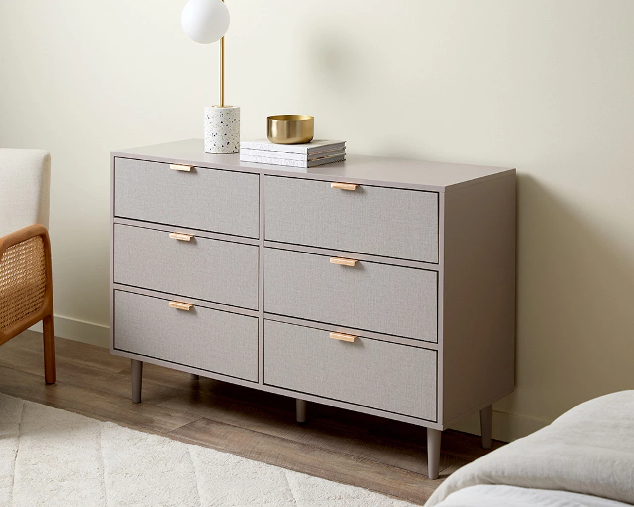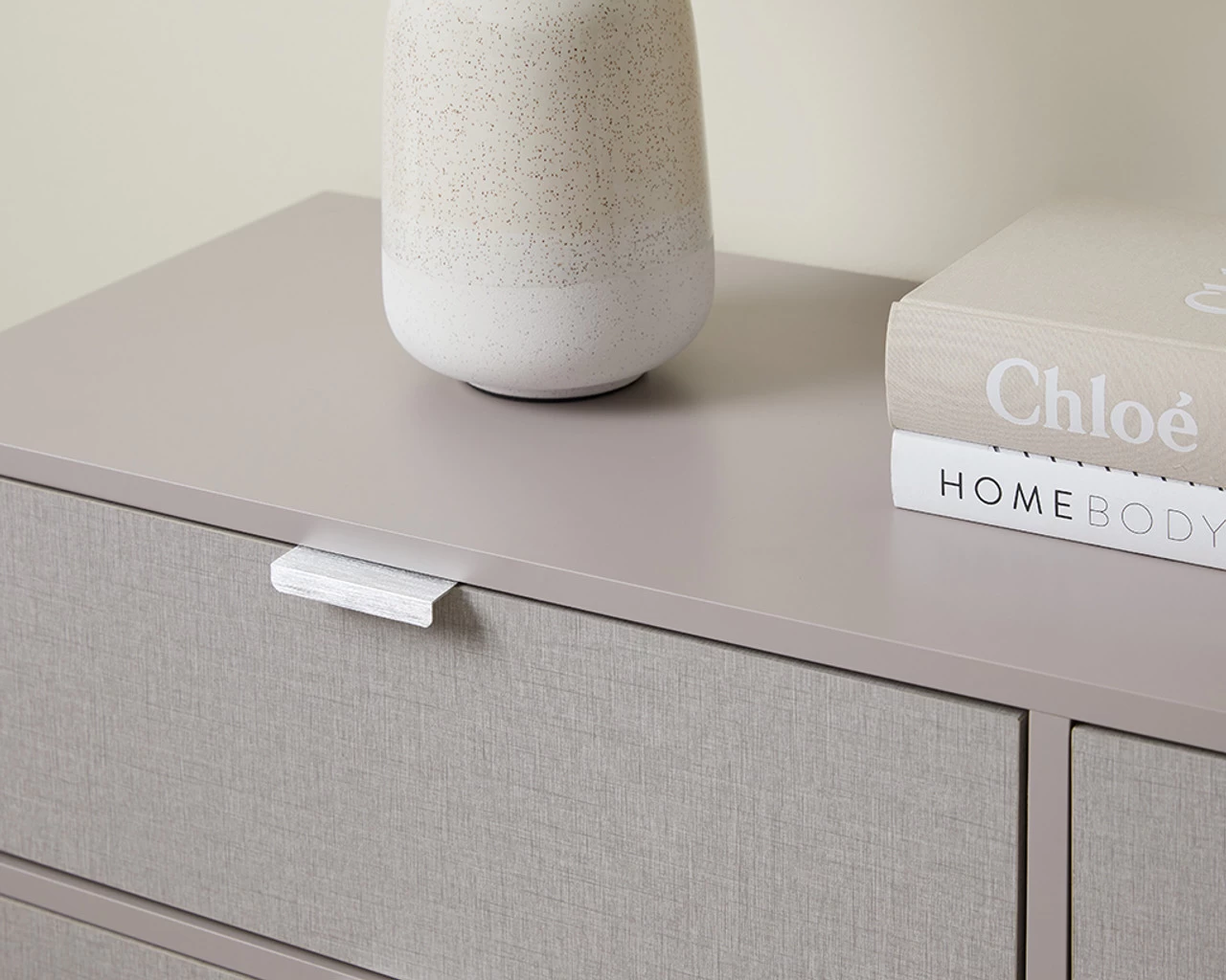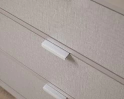 Bring chic style to your bedroom and living spaces with the Mabel Six Drawer. It’s modern outline, earthy mushroom colourway and textured look drawers adds distinct design to your home interiors. And the best bit? With these drawers, you can choose between either silver or brushed gold handles for customisable home style. It’s not only super stylish but also functional with six sliding drawers providing spacious storage in a dining room, living room, bedroom, or office. A stylish unit to keep your home tidy and clutter-free, it also has plenty of styling space on top for artwork, vases, plants, and other décor.