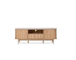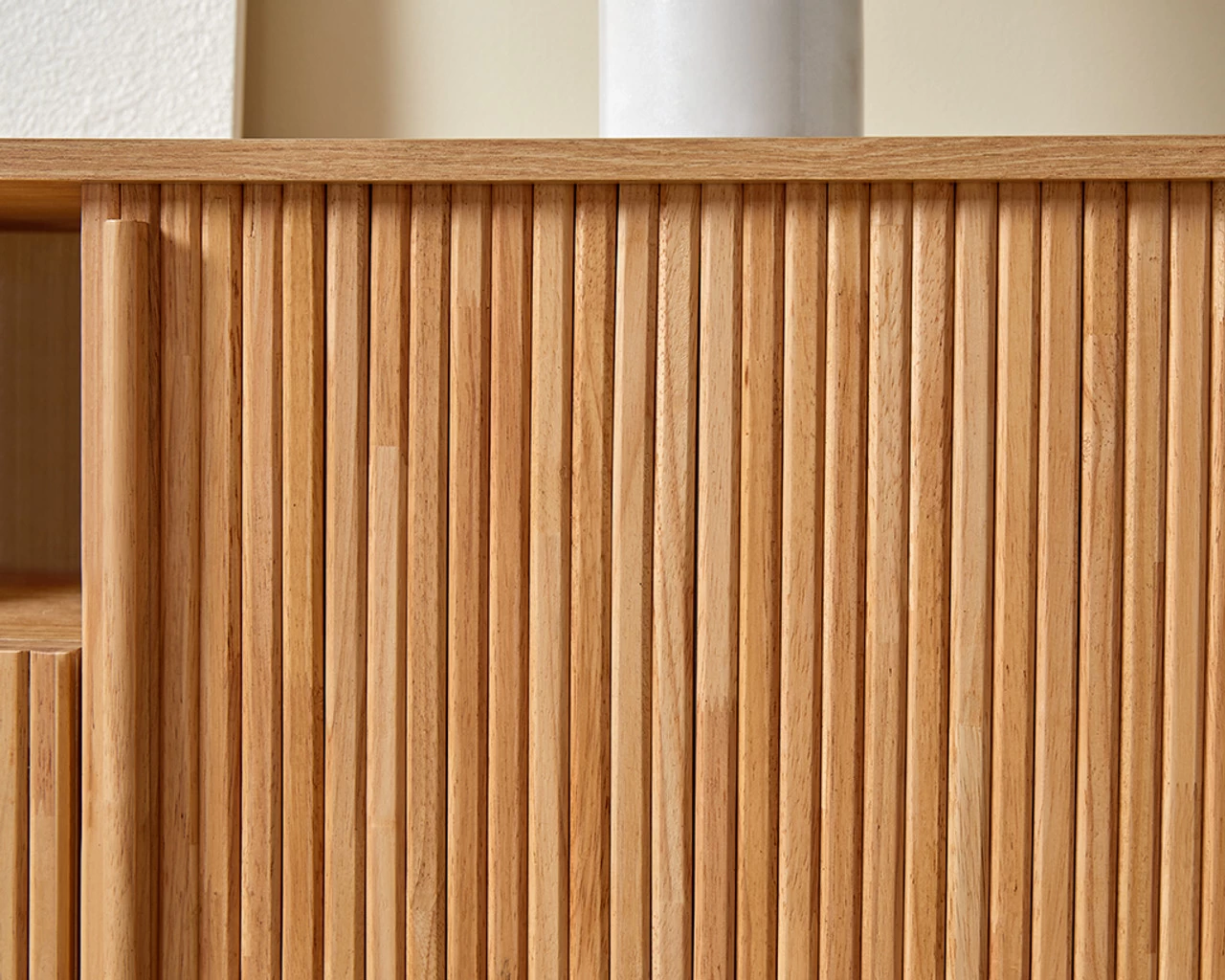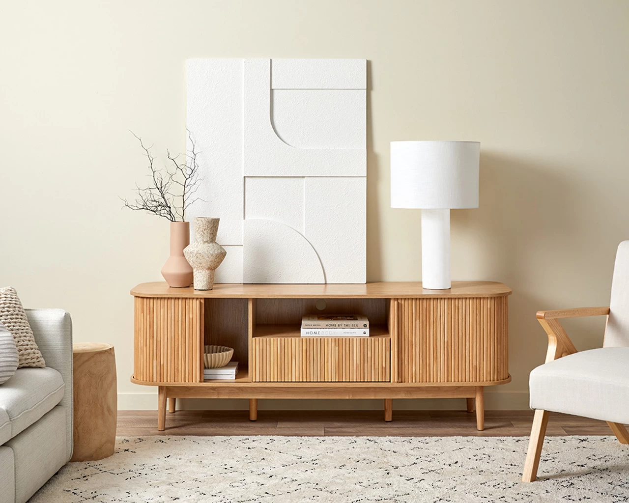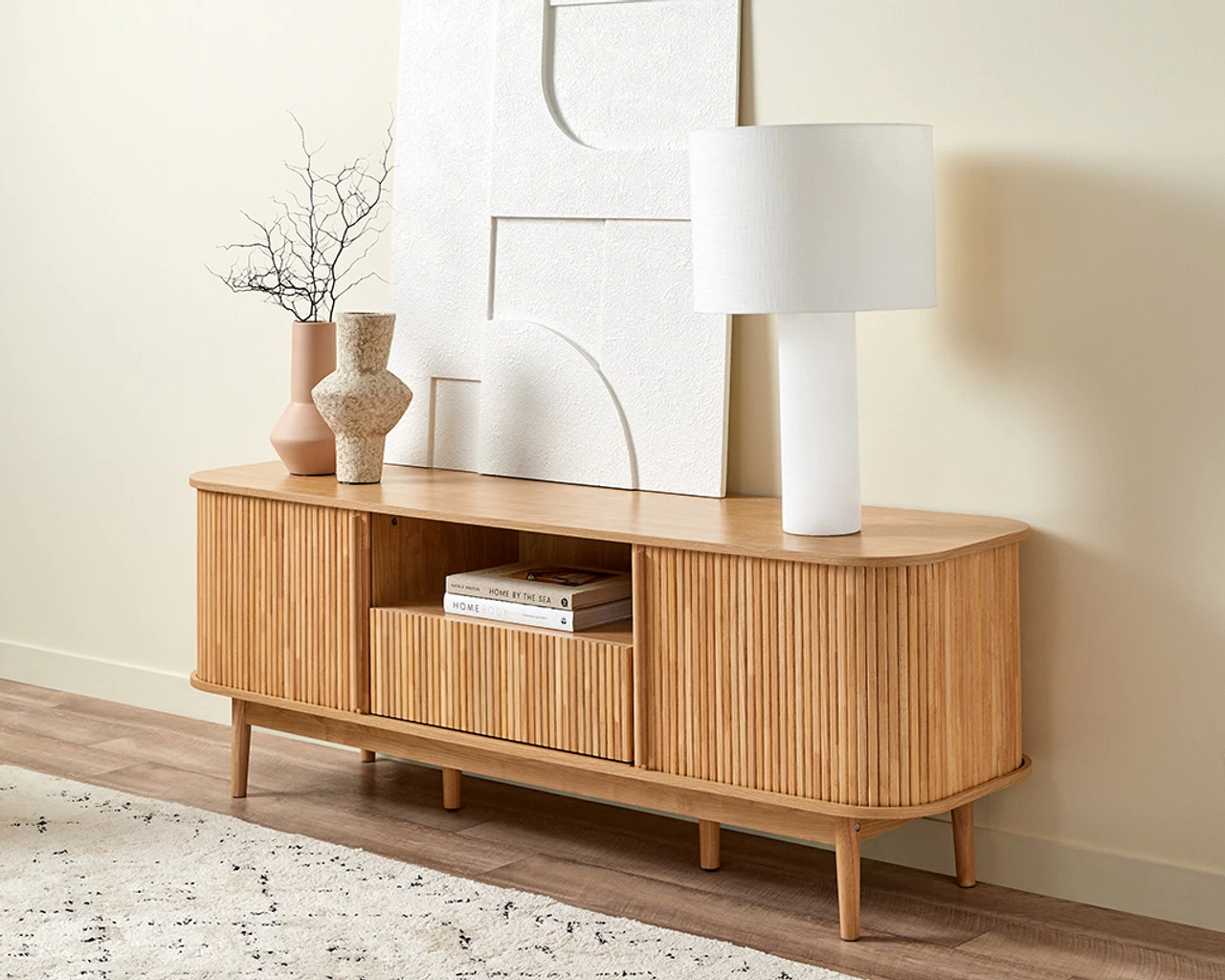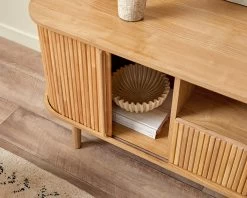 Transform your living space into a cosy coastal retreat with the Maeve Entertainment Unit. With its modern coastal style, textured, ribbed wood detailing, and a soft, curved shape, this beauty brings the perfect blend of warmth and style to your home. Designed with functionality in mind, this TV unit offers ample storage space to keep your living area clutter-free. It features two spacious cupboards, sliding doors for easy access, and a convenient centre open shelf. And don’t worry about messy cords – we’ve got you covered with a discreet hole in the back for hassle-free cord management. Designed in house, this unit is not just a storage solution, but a statement centrepiece piece in your living room, providing a cosy retreat for your entertainment essentials while adding curved coastal warmth to your home.