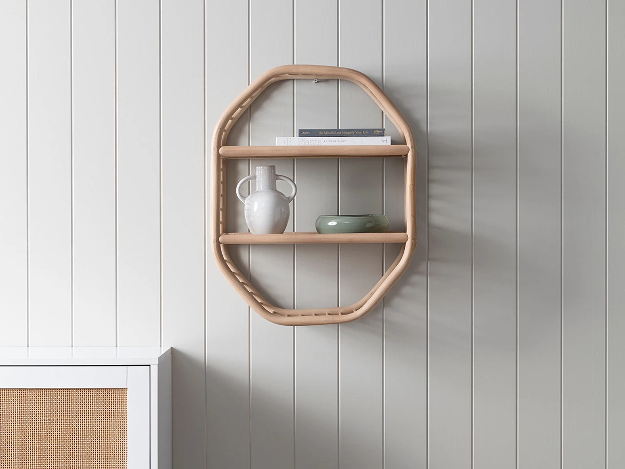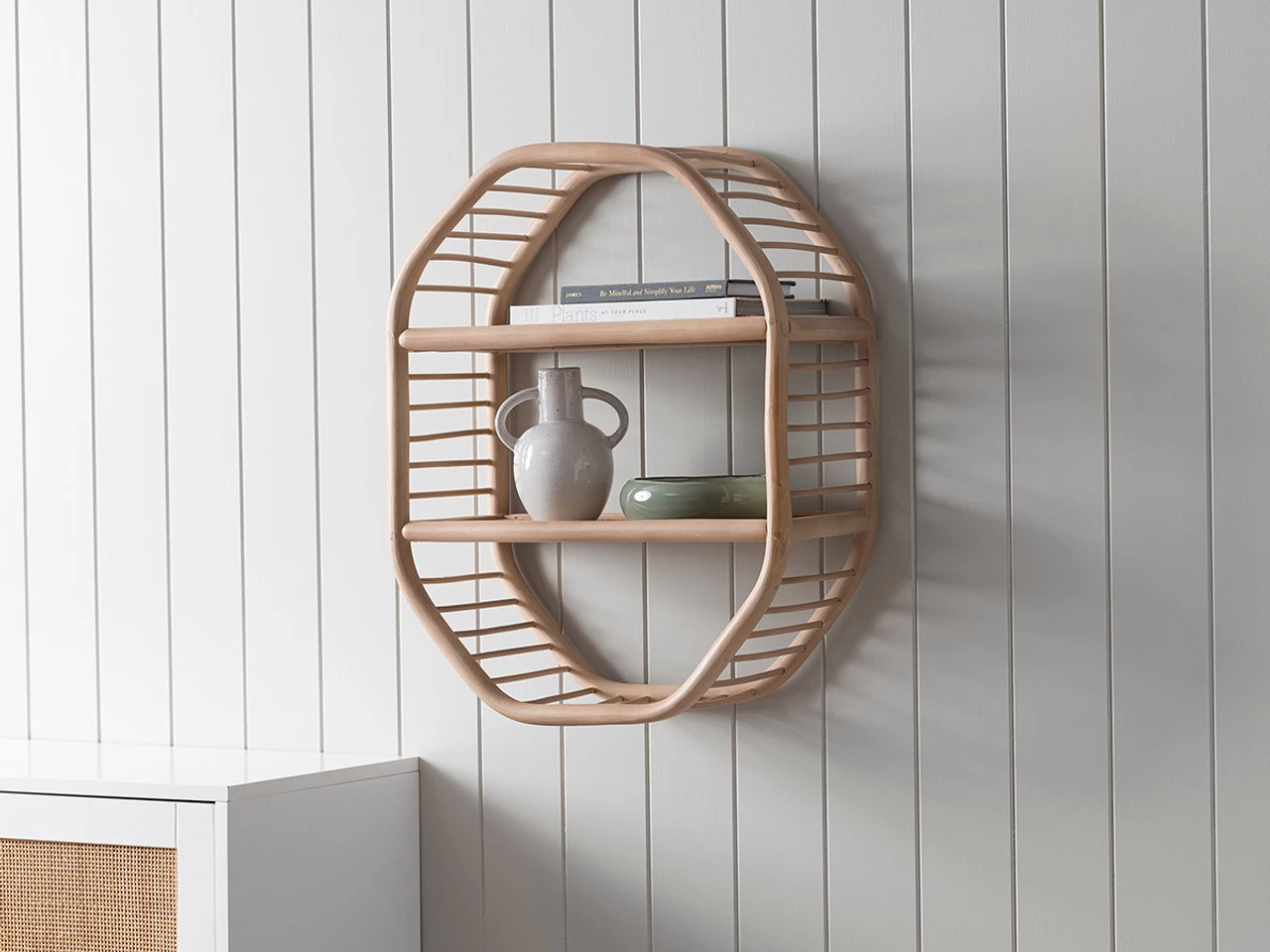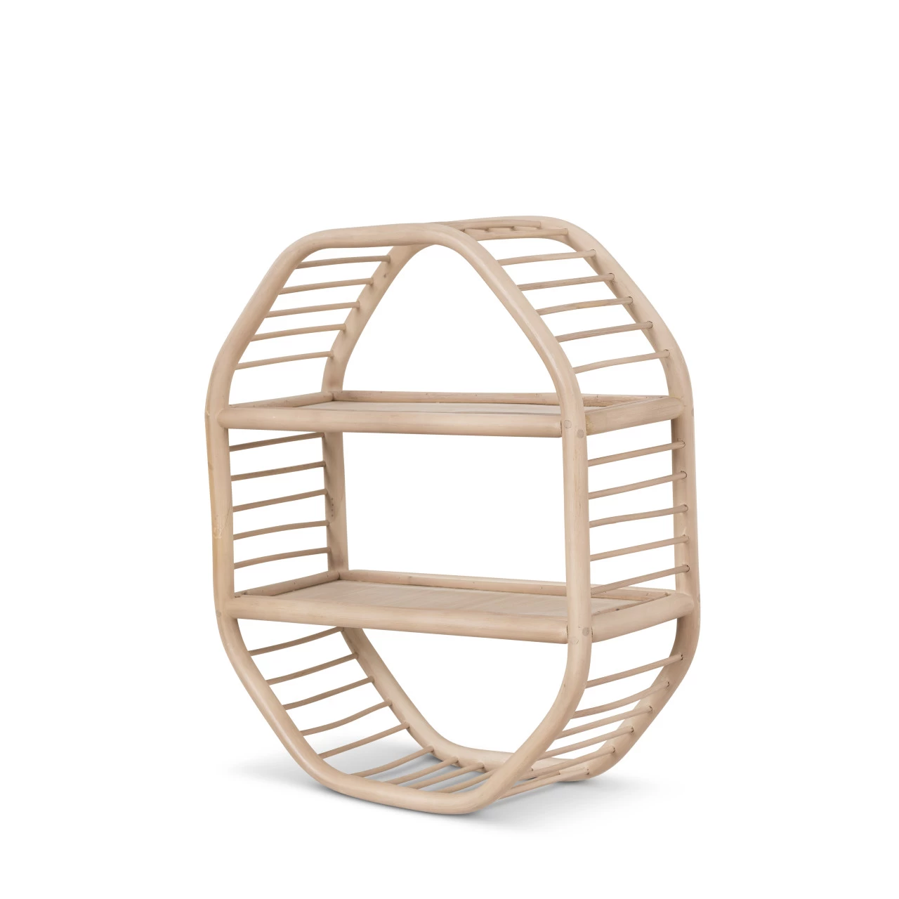 The Marvin Rattan Hexagonal Wall Shelf is a striking, unique floating shelf to add to your home. Made from rattan, this hexagonal floating shelf is easy to hang flush against a wall and adds a stylish shelving option to a room. Featuring two shelves, it is perfect for styling books, photos, plants, and other lightweight décor. The eye-catching, hexagonal shape makes this a gorgeous feature above a console table, in a hallway, reading nook, or on any wall in your home. With a subtle bohemian vibe, this rattan wall shelf adds natural texture and warm elements into any space.