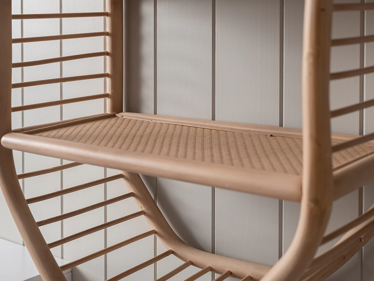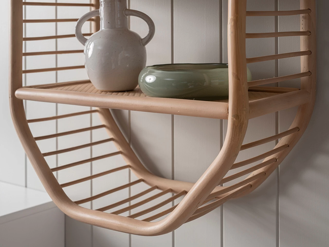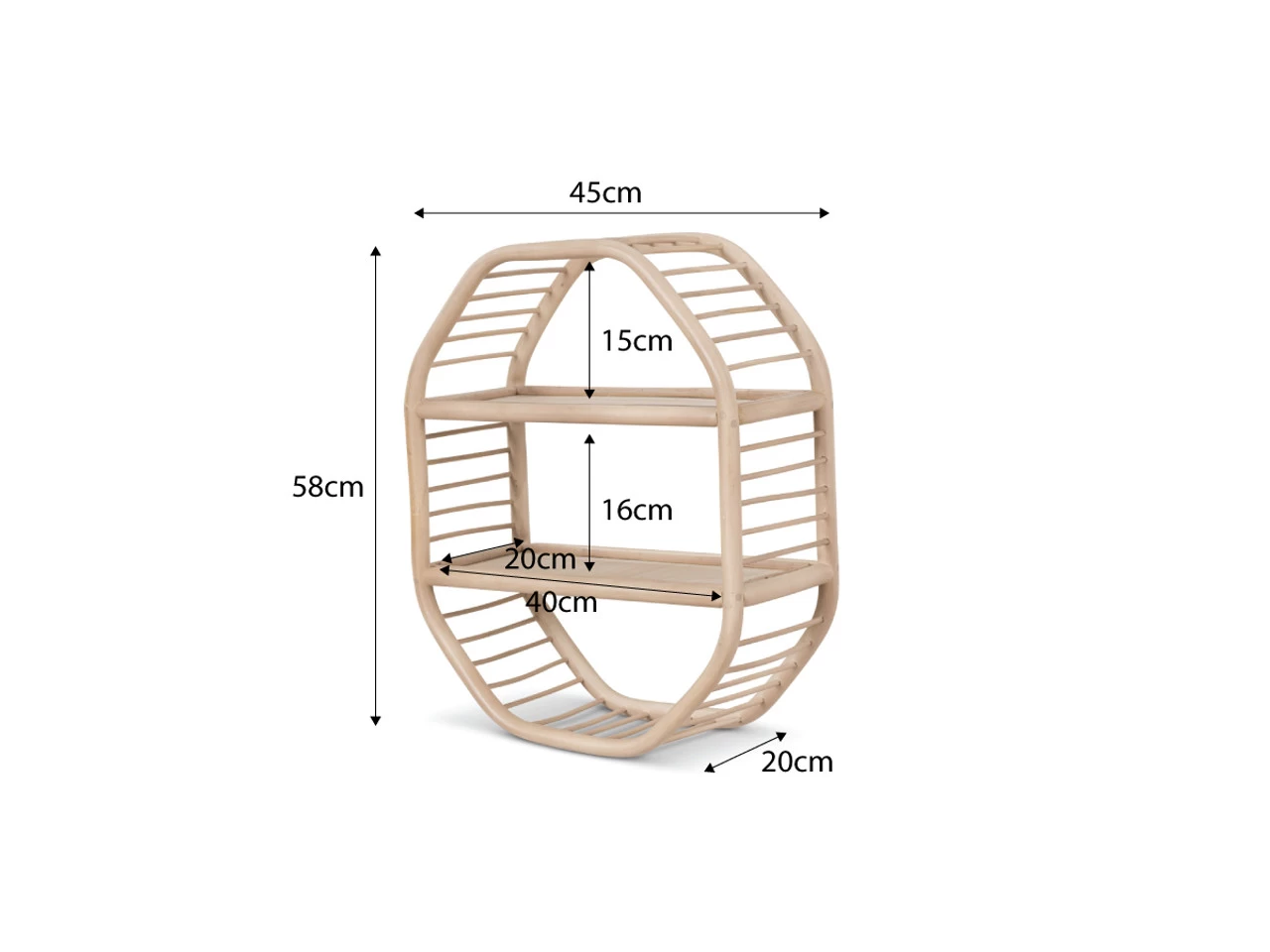 The Marvin Rattan Hexagonal Wall Shelf is a striking, unique floating shelf to add to your home. Made from rattan, this hexagonal floating shelf is easy to hang flush against a wall and adds a stylish shelving option to a room. Featuring two shelves, it is perfect for styling books, photos, plants, and other lightweight décor. The eye-catching, hexagonal shape makes this a gorgeous feature above a console table, in a hallway, reading nook, or on any wall in your home. With a subtle bohemian vibe, this rattan wall shelf adds natural texture and warm elements into any space.