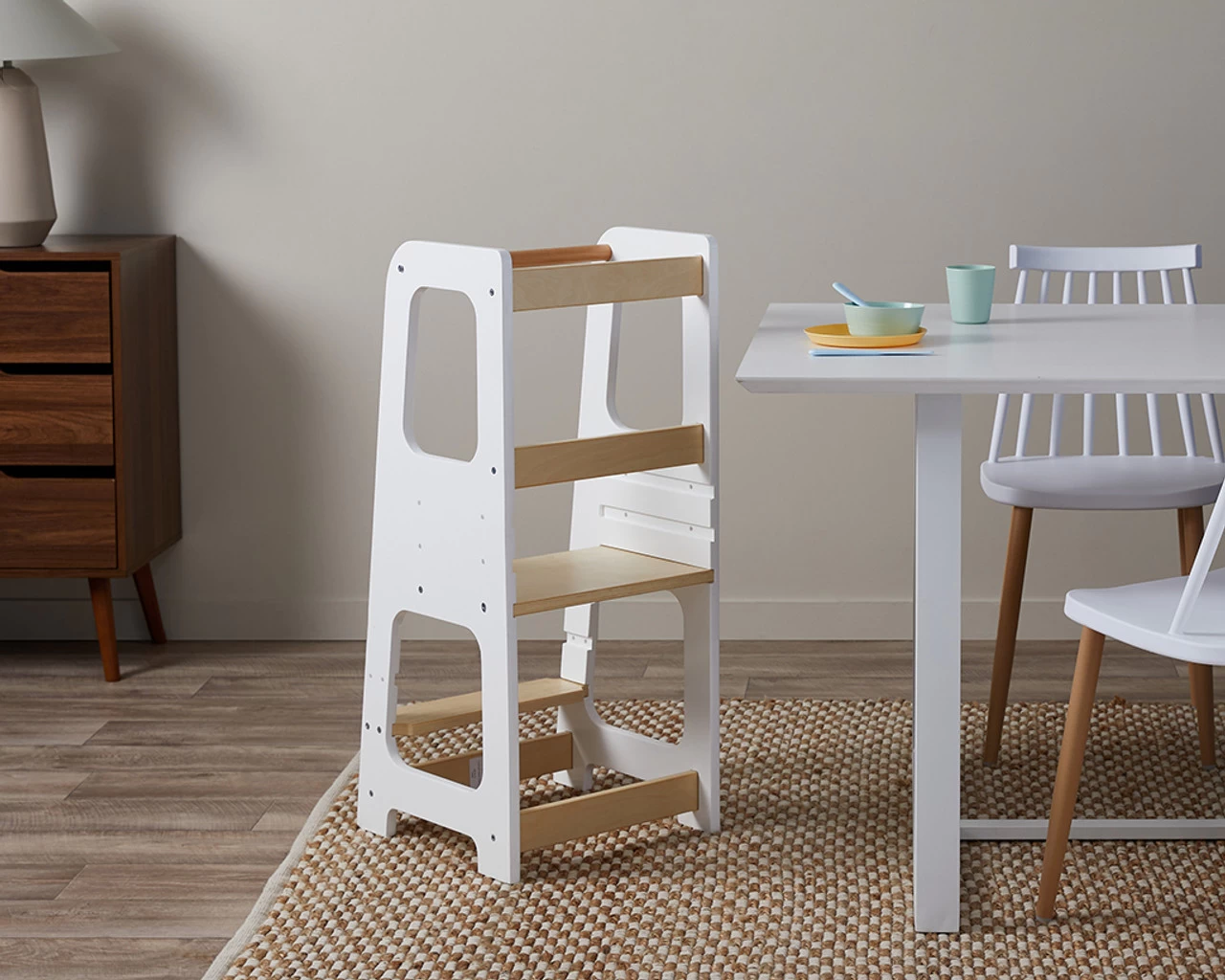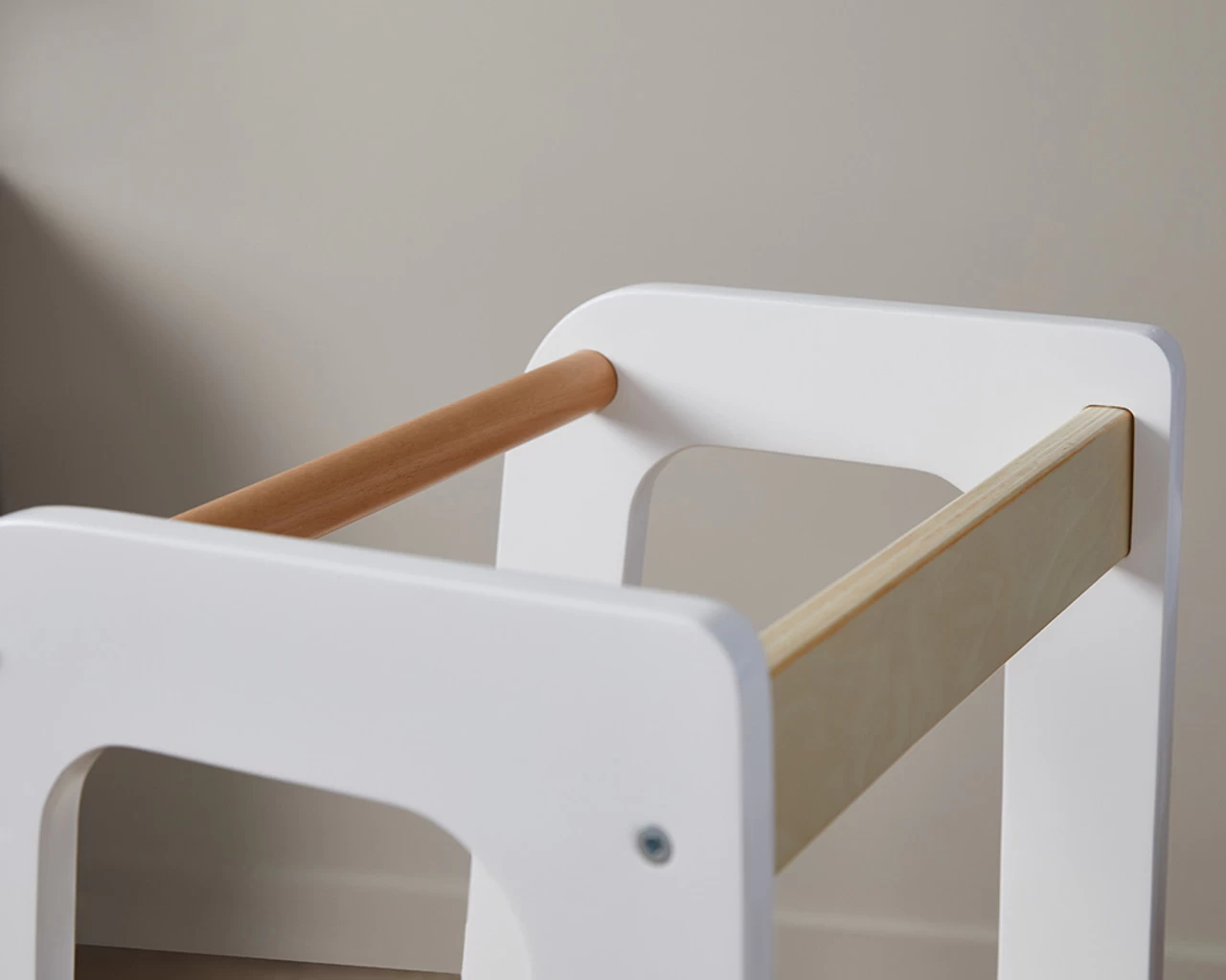 A handy helper around the house, the Mocka Learning Tower gives toddlers a step up. This safe wooden step stool for kids has an elegant, two-toned Scandinavian look to pair effortlessly with your home style. It’s also adjustable with 3 step heights, giving you plenty of versatility depending on the height of your little one and the height of the bench they need access to. Whether baking in the kitchen or brushing their teeth, your child will love being involved. You can rest assured your little one will stay safe too, as our Mocka Learning Tower has a solid wood construction and complies with all relevant Australian and New Zealand safety standards. It has a wooden safety bar at the top too, making it extra secure – perfect if you have any adventurous mini-me’s in the family. Matching your homestyle, easily assembled and a solid safe construction, the whole family will love this toddler learning tower.