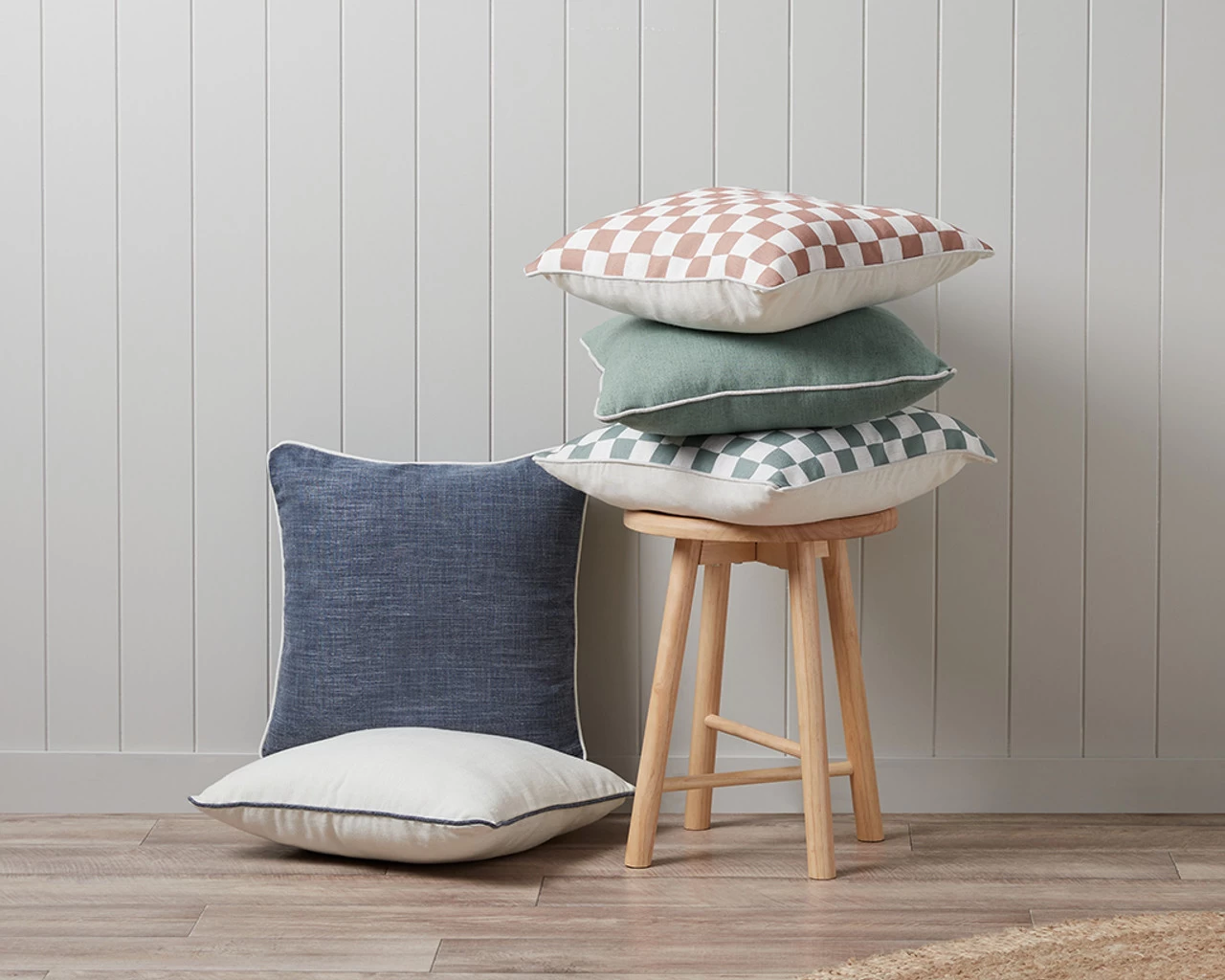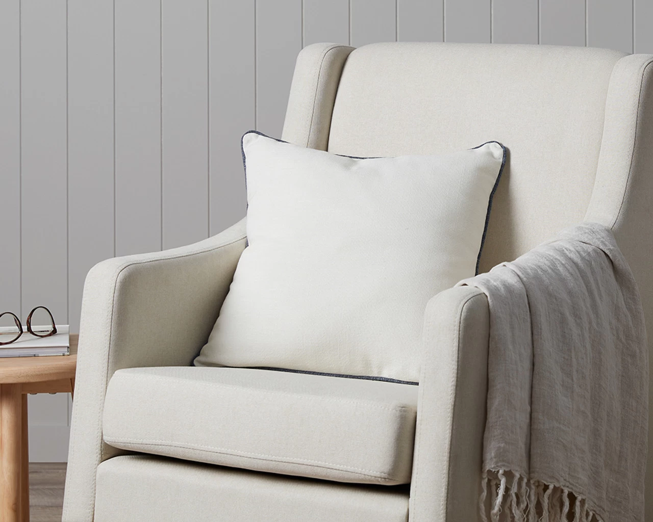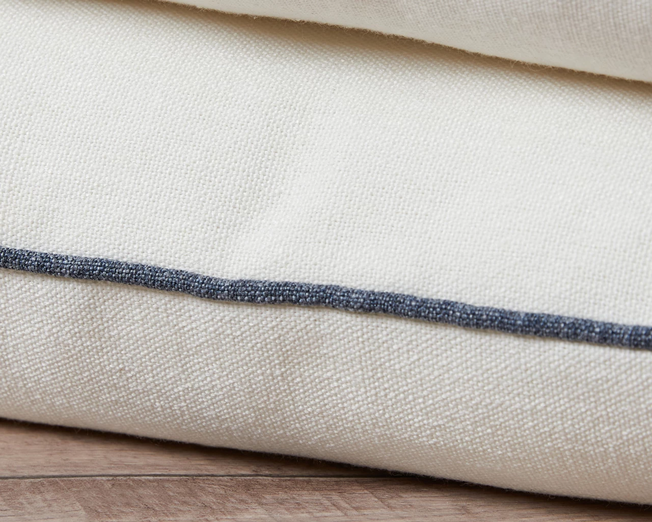 Add elegant, relaxed style to your sofa, armchair or bed with the Mocka Piped Cushion – White/Navy. Its natural white tone complements your space and features a navy piped trim for a classic, statement look. It’s a great way to achieve a simple Hampton’s style to your home. Made from a linen blend for on-trend style and a soft feel. It comes with a plush insert for cushy, sink in comfort. And the cover is removable, and colour fast tested, so it’s easy to keep it looking fresh.