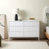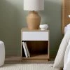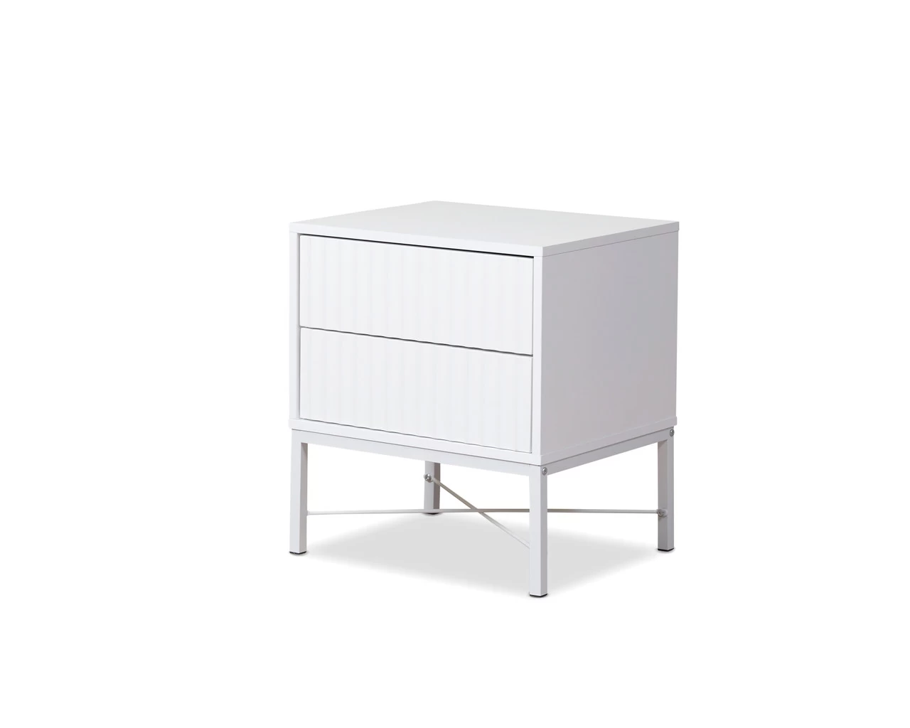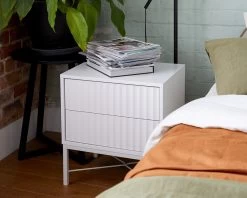 Give your bedroom a refined look with the statement Nyla Bedside Table – White. Its ribbed drawer fronts playfully catch the light on the elegant, scalloped design and create gorgeous interest beside your bed. A great way to add texture into a room, this stylish look is wonderfully on-trend. This textured detail pairs beautifully with the otherwise sleek lines and bright, white colourway for an elegant, chic style to add to a primary bedroom, guest bedroom or teen or kid’s bedroom. Outside of the bedroom, this side table would also look stunning in a lounge room setting as an end table next to a sofa or armchair. While on-trend, it’s also brilliantly functional with two push-to-open, easy-slide drawers with handy storage to curb clutter. The best part? The flat surface for styling décor and a versatile size to slot into any home.