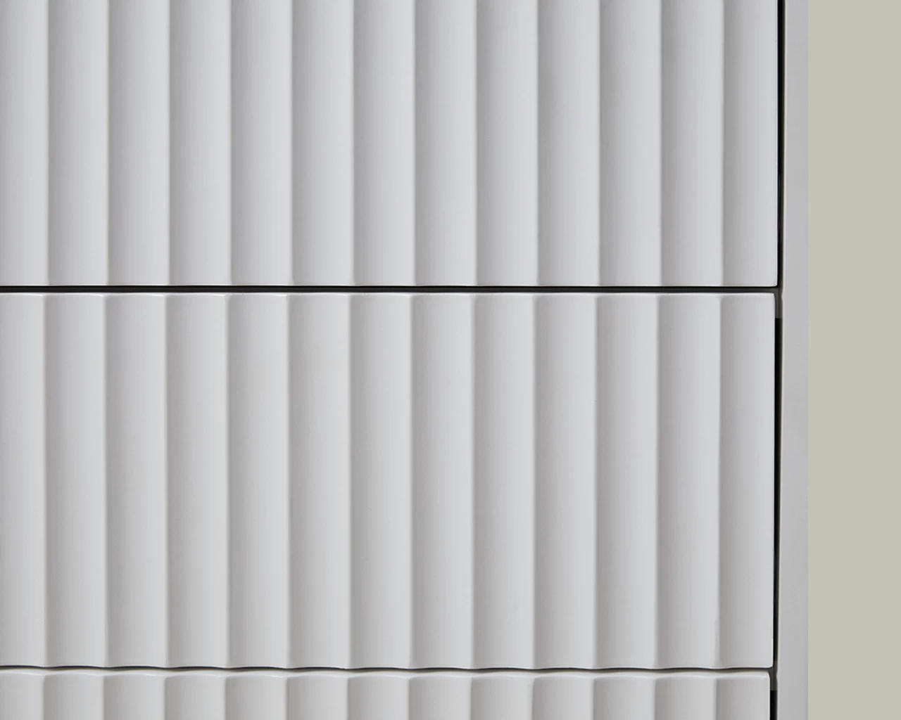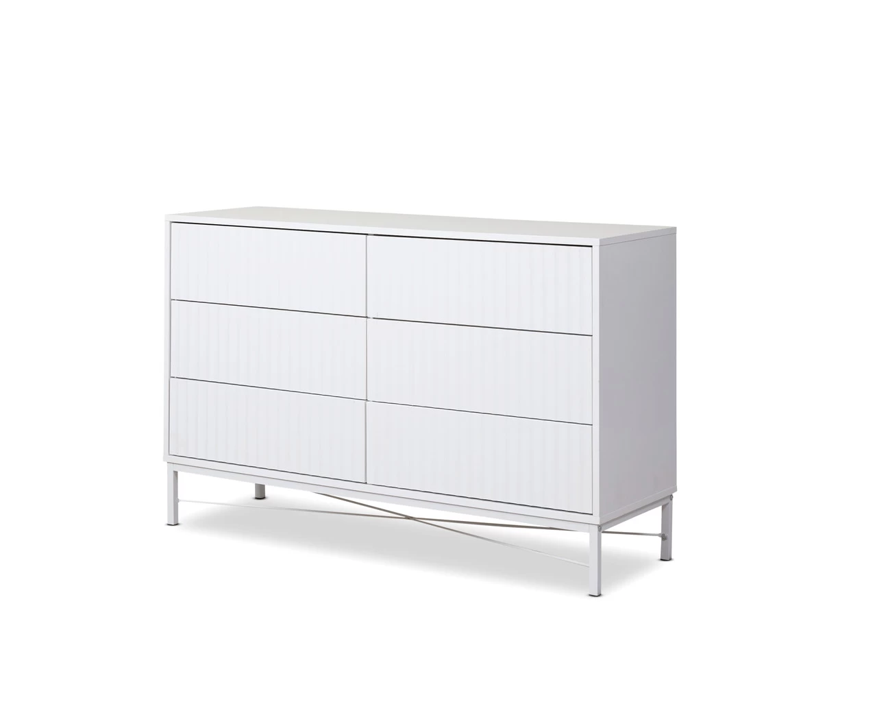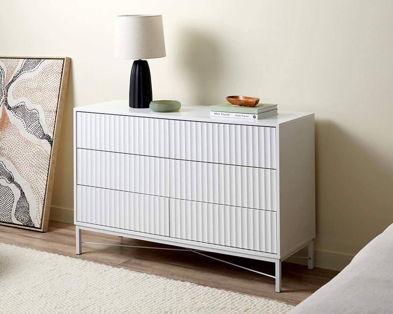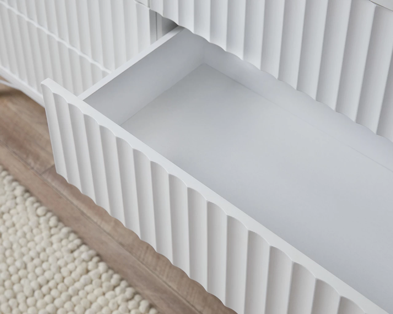 Give your home a refined look with the statement Nyla Six Drawer – White. Its ribbed drawer fronts provide a point of interest and playfully catch the light on the elegant, scalloped design. A great way to add texture into a room, this stylish look is wonderfully on-trend. This textured detail pairs beautifully with the otherwise sleek lines and bright, white colourway for an elegant, chic style to add to a living room, dining room or bedroom. While on-trend, it’s also brilliantly functional with six push-to-open, easy-slide drawers all spacious enough to curb any clutter. The best part? The flat surface for styling décor and a versatile size to style under a mirror, artwork, or window.
