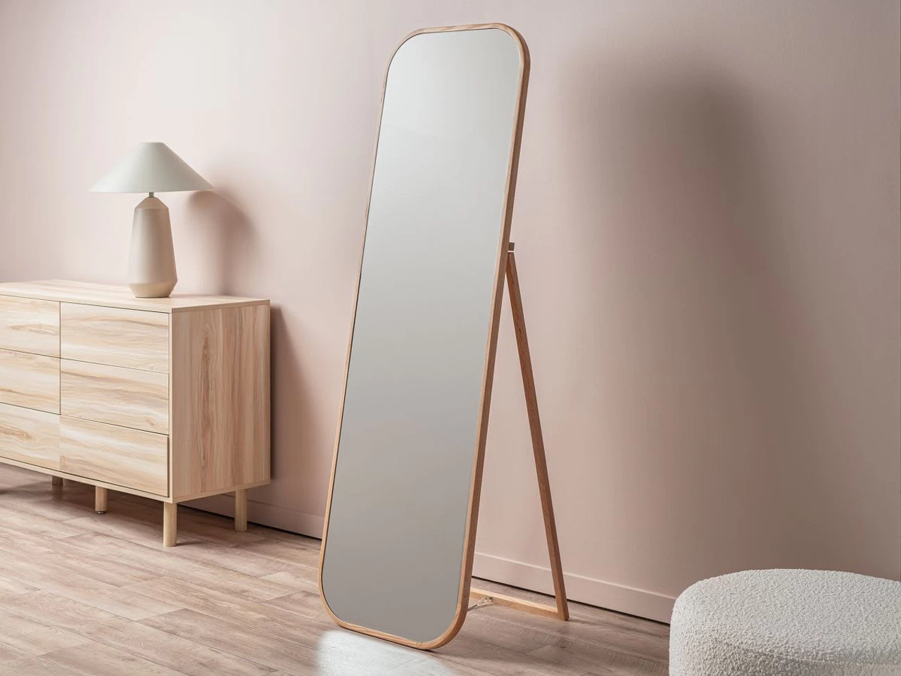 With a 160cm x 60cm size, this mirror is ideal for everyday use and will easily suit any wall/room size in a home. Perfect for use in a bedroom, living room or other space in your home, you’ll always have a chic mirror to give your outfit a once-over when getting ready. Featuring a strong and sturdy kickstand, this curved rectangular mirror with oak wood frame is completely freestanding ensuring a stable mirror for your home.