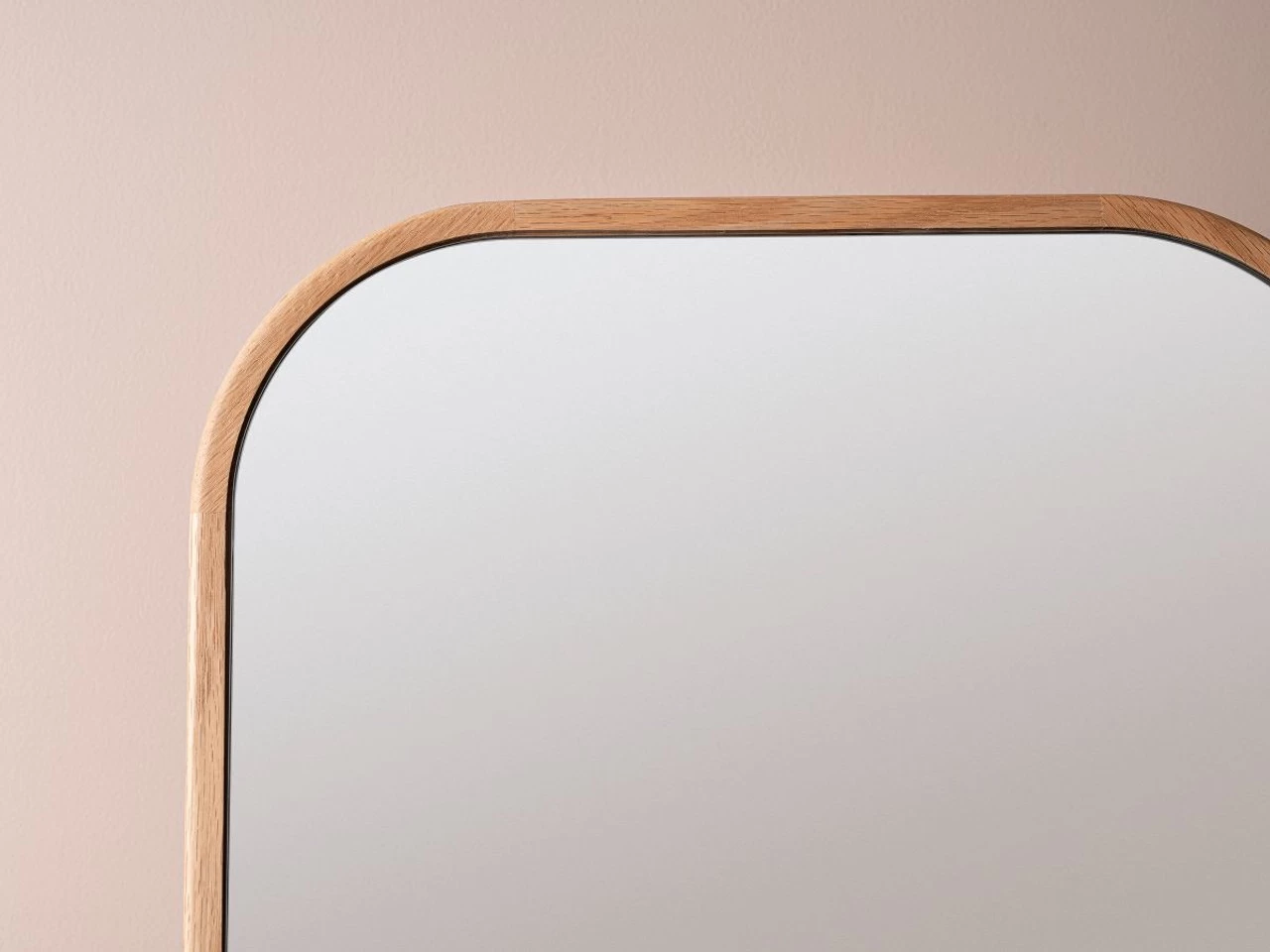 The Ola Full Length Curved Rectangle Oak Mirror is a freestanding, wooden mirror with a kickstand. With a tall, rectangle shape, this wooden mirror features curved corners for a soft, elegant style. Both decorative and functional, this oak framed mirror makes a room feel more spacious than it is while brightening a room by reflecting the available natural light.