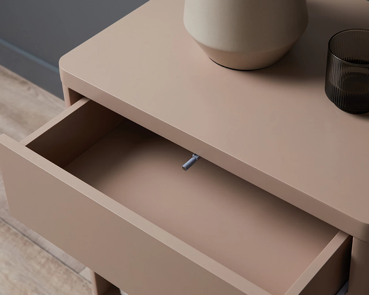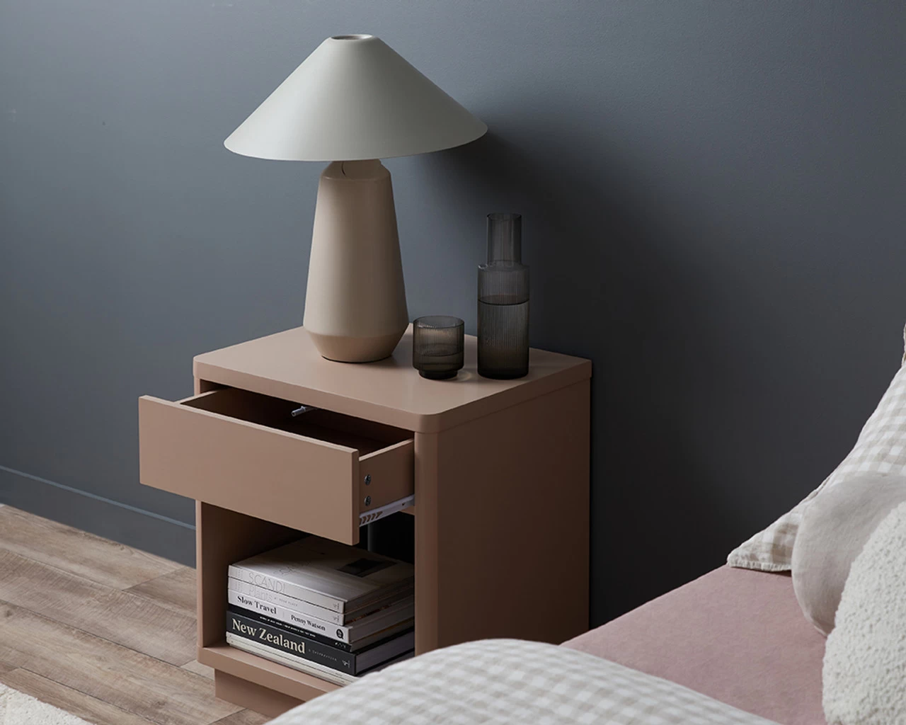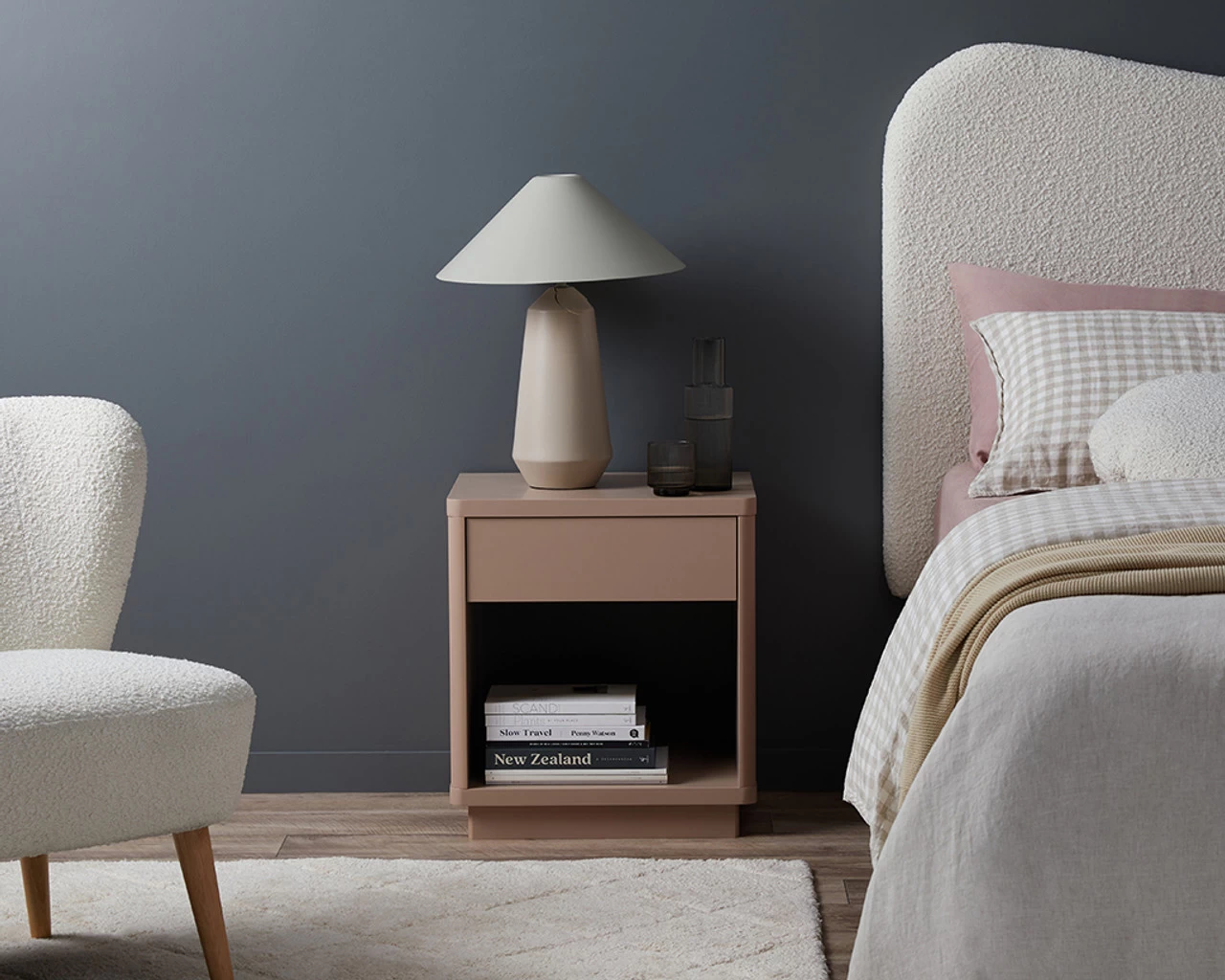 The Oslo bedside table – Sand is inspired by nature with a cosy, natural colourway, and on-trend curves. Inspiring comfort in your home, this Australian designed side table is ideal for any bedroom in your home. With enough room up top for your lamp and chargers, along with a push to open single drawer for the essentials you want hidden but handy, you’ll have everything you need for bed side storage. The spacious open shelf is the perfect space for your books or to add your signature style with a stunning piece of décor. Sturdily designed with a plinth base, style a matching pair either side of your bed for cosy symmetry. If using outside of the bedroom, you’ll love it as an end table placed beside an armchair or sofa for handy storage. Browse the rest of the Oslo range to complete the look.