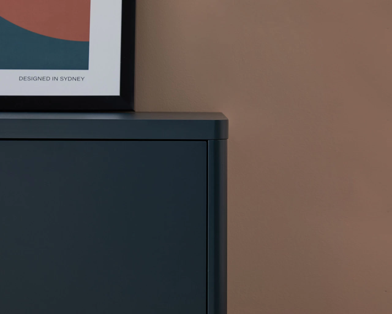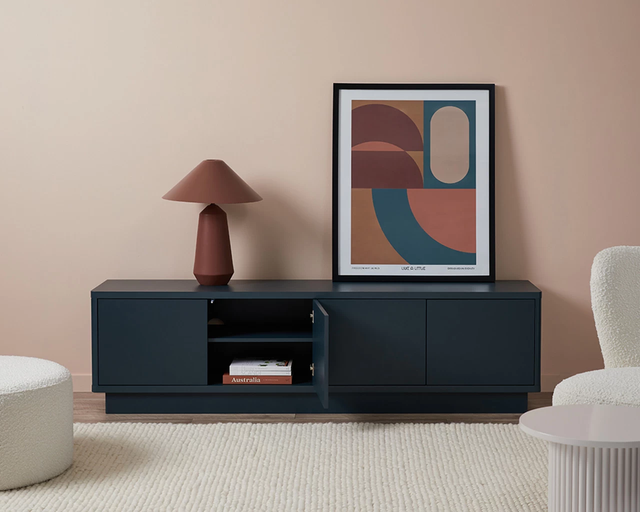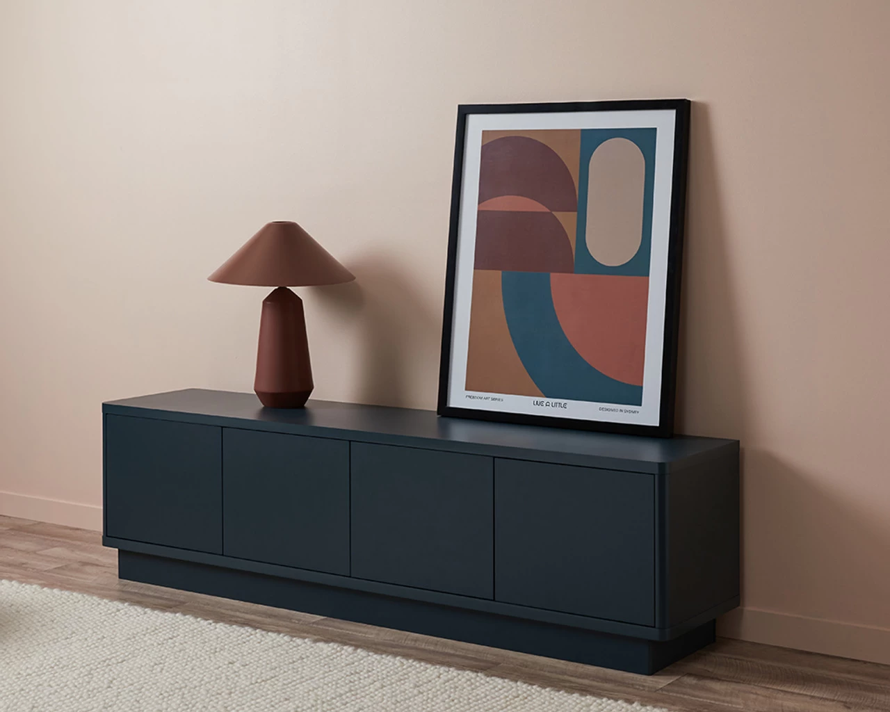 The Oslo Entertainment Unit – Ink is an Australian designed TV cabinet with a dark, ink-toned colourway, on-trend curved edges and a plinth base to create a stylish centrepiece in your living room or media room. Style under a wall-mounted TV to make just the right statement in your lounge room. It has more than enough surface space to style with eye-catching décor or to perfectly position your sound bars and smart devices. The four spacious cupboards have push to open doors and internal shelving so it’s easy to keep your consoles and cords accessible, organised and behind closed doors. Trust Oslo for your entertainment needs – it’s affordably priced, on-trend, and effortlessly stylish.