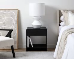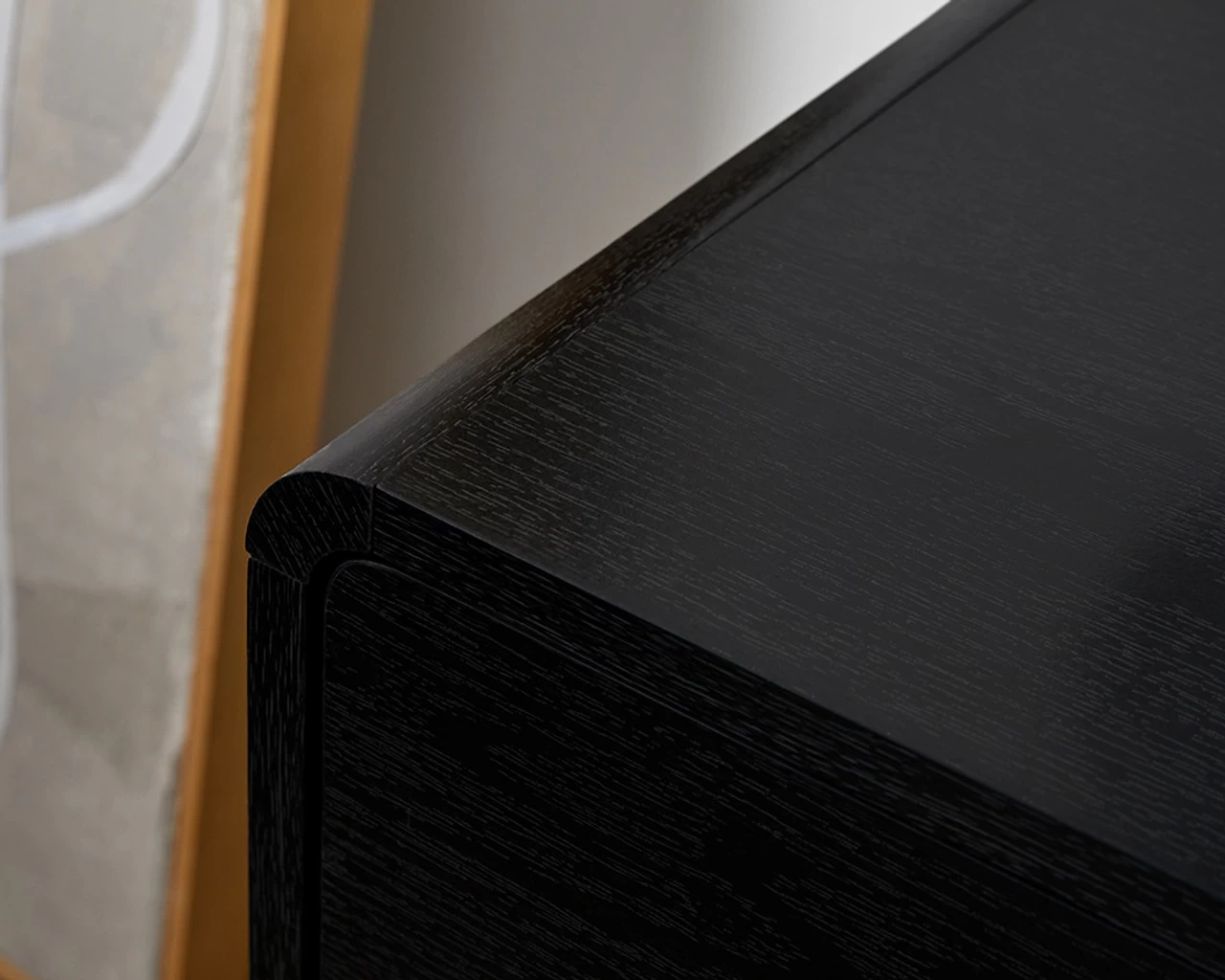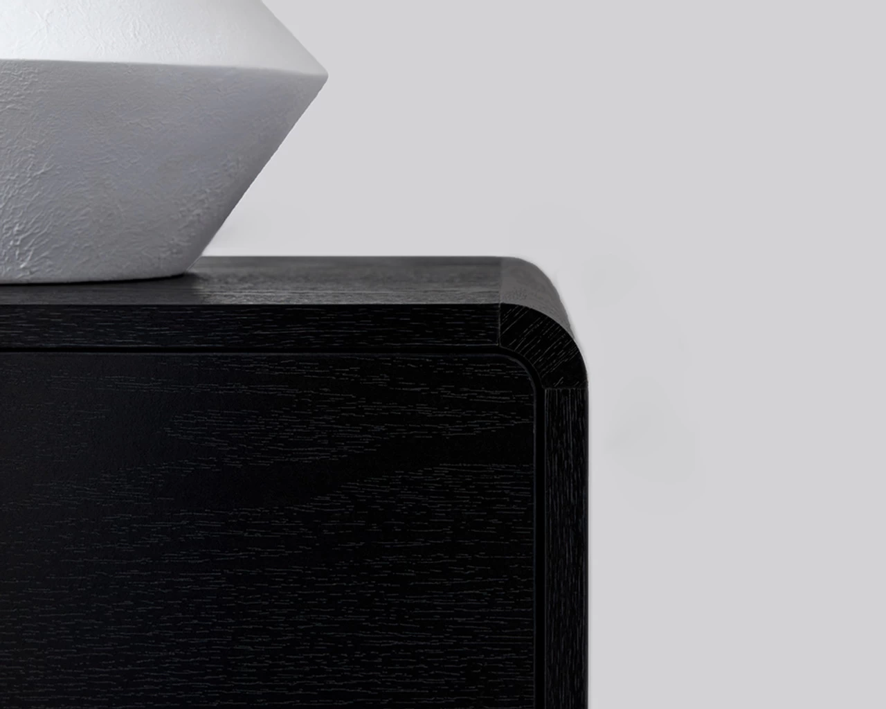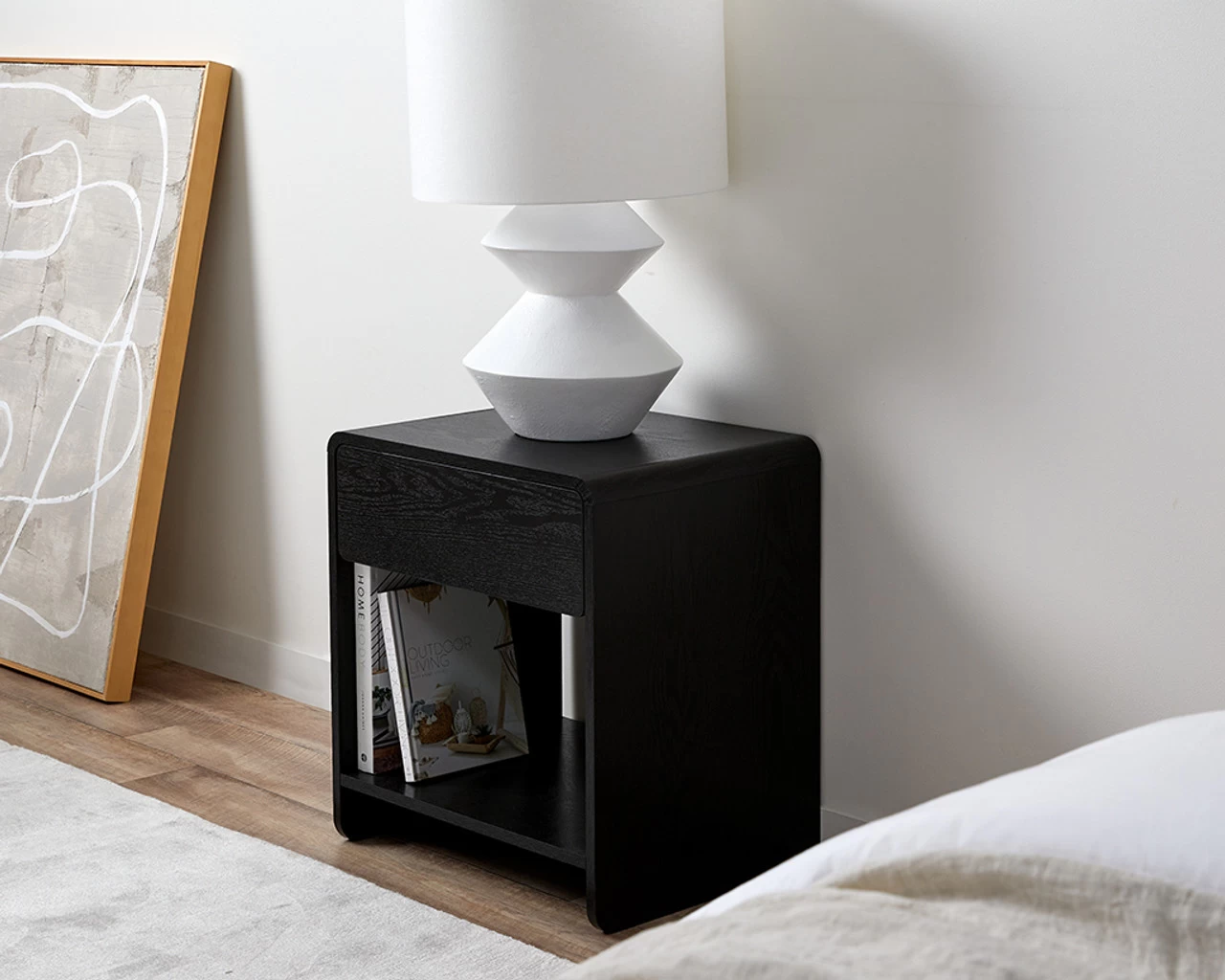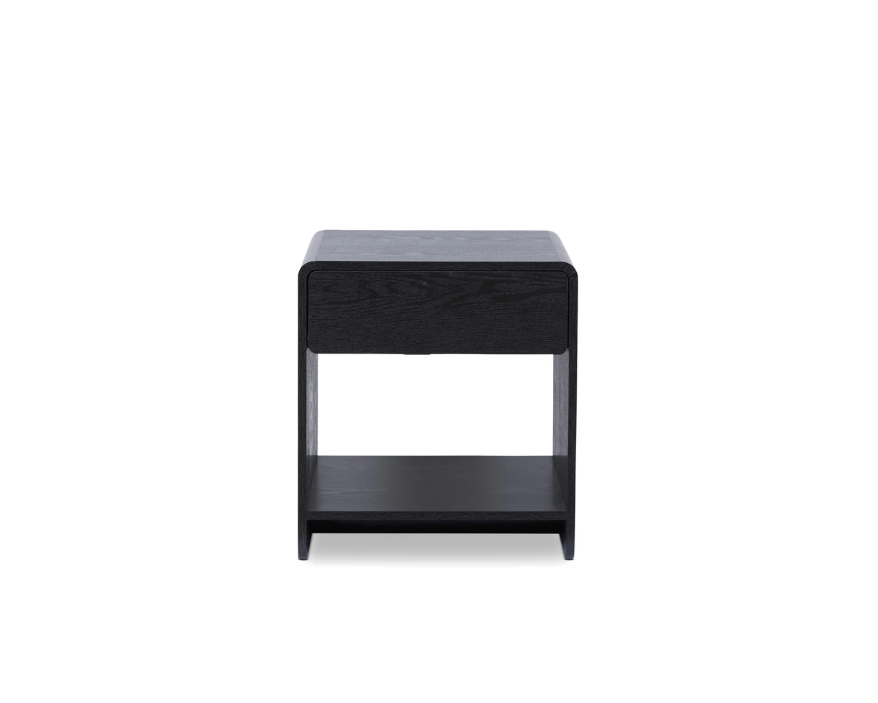 Refresh your bedroom style with the Owen Bedside Table – Black. With a stunning blend of Minimalist and Scandi design, this side table is a stylish all-rounder that will suit any bedroom space. Designed with rounded corners and a bold black colourway, this side table has a wood grain look finish for a stylish texture beside your bed. Ideal for creating a grounded and moody bedroom, this bedside table isn’t just about looks—it’s highly functional too. With a convenient shelf and a spacious drawer, it offers ample storage for your bedtime essentials. Whether you need a spot for your favourite book, a cup of tea, or a place to stash your charging cables, this bedside table has you covered.