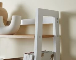 Solve that storage problem, with the Mocka Porto Five Shelves – White. This shelving unit is contemporary, practical and versatile – sure to suit any room in your home. With a sturdy metal frame and grained wood-look shelves, they provide ample space for all your storage needs.