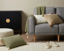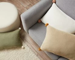 Pretty in pink and pompoms, the Priya Pompom Knit Cushion – Ivory/Pink is an elegant must-have piece for timeless home décor. Made with a 100% cotton cover, this lumbar scatter cushion features a tight, knitted weave and will add cosy style to any bedroom or living space. The chic ivory base is an elegant neutral, while the pink pompoms on each corner give this cushion a touch of fun, boho style. Filled with a plush, polyester filling and with a 30cm x 55cm size, this elegant cushion is ideal as a standalone piece or as a styling base on a sofa, bed, armchair, or occasional chair.