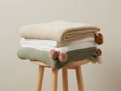 • Cuddly and cosy knitted weave texture with statement pompoms