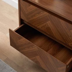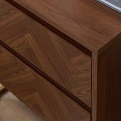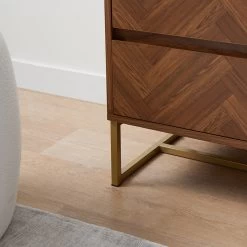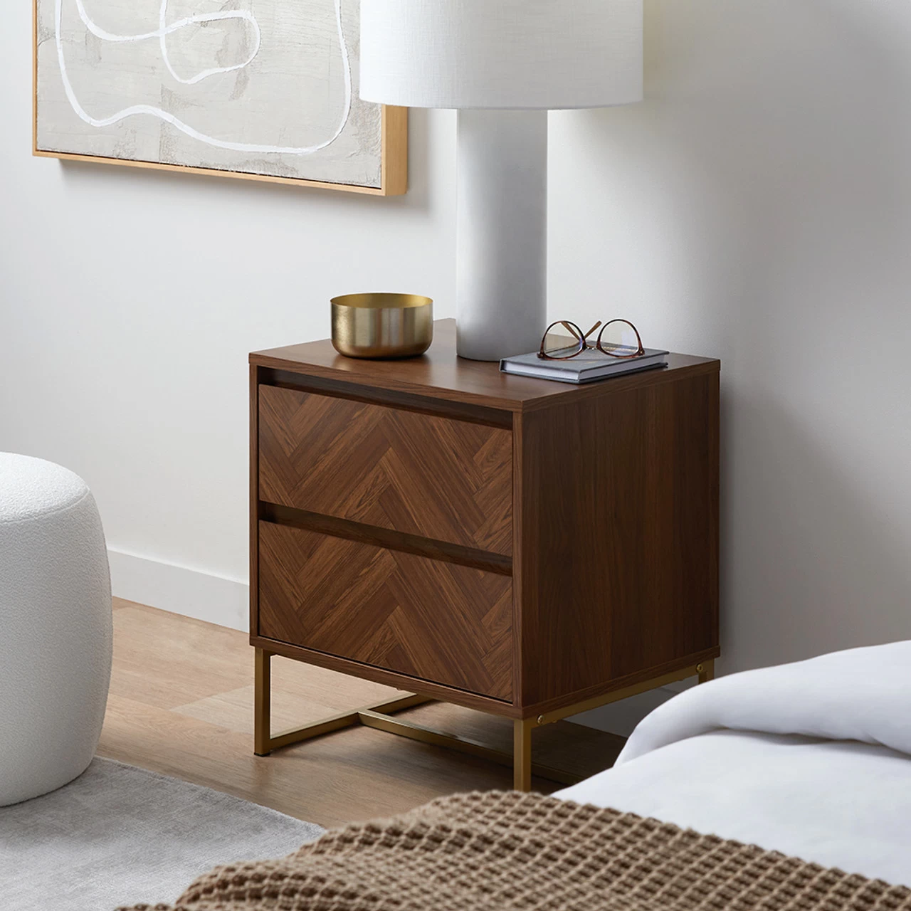 The Rupert Bedside Table is a contemporary side table that’s got all the chic vibes. The brushed bronze metal base gives it a modern, sophisticated look that will add a touch of class to any bedroom. Rich in colour, the walnut-look finish just oozes elegance and is the perfect complement to your decor. And the best bit? The on-trend chevron finish on the drawer fronts is seriously stylish and adds so much character to this bedside table. Style a pair on either side of your bed or use it in a living space as a side table next to an armchair or sofa. The two sliding drawers provide ample storage for all your essentials, making it both practical and beautiful.