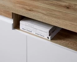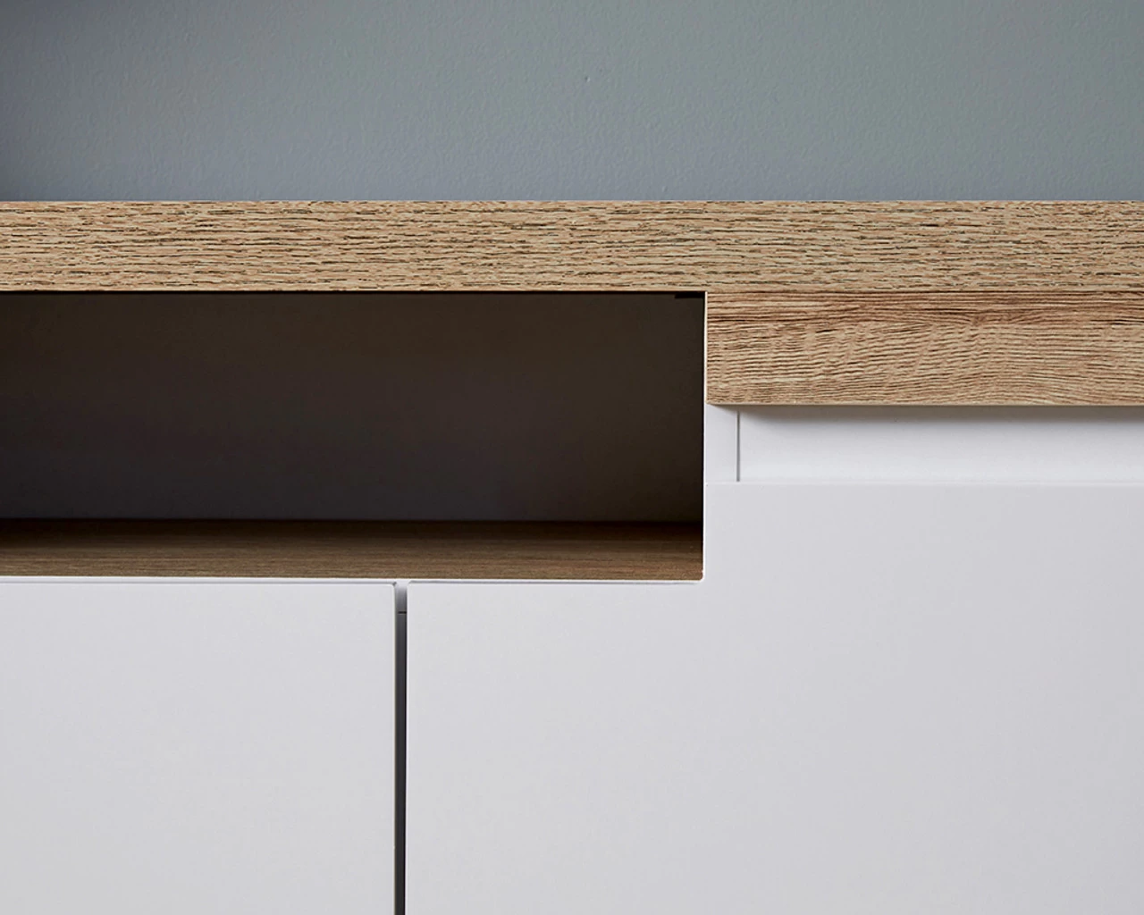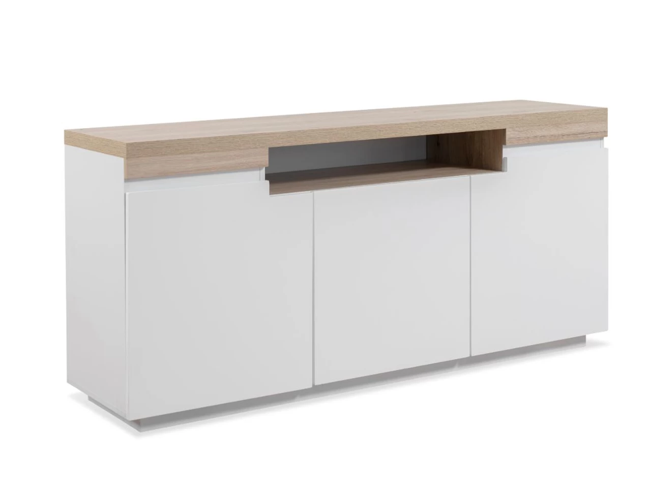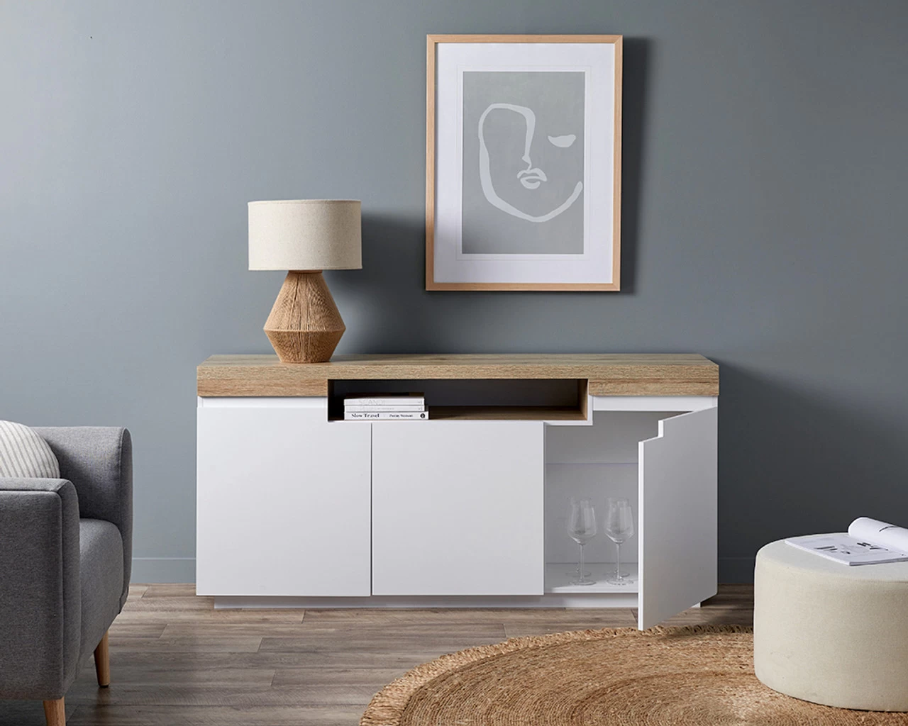 Bring the elegantly coastal vibe of coastal to your home with the Sadie Buffet Three Door. With a modern outline, light wood-look top and crisp white body, this storage cabinet feels bright and fresh in your home. Perfect for the dining room, living room and home office, it’s not only gorgeously on-trend, but also very functional. The three cupboards each have an adjustable shelf inside for flexible, spacious storage for anything you want to store. The handle-less, hinged door design is sleek and makes opening and closing the cabinets smooth and quiet. The open recess in the centre is ideal for books, while the surface is perfect for styling with décor or as a handy surface to serve food during dinner parties or holidays, so you don’t need to take up valuable space on the dining table. Match back with the rest of the Sadie range for stunning style throughout your home.