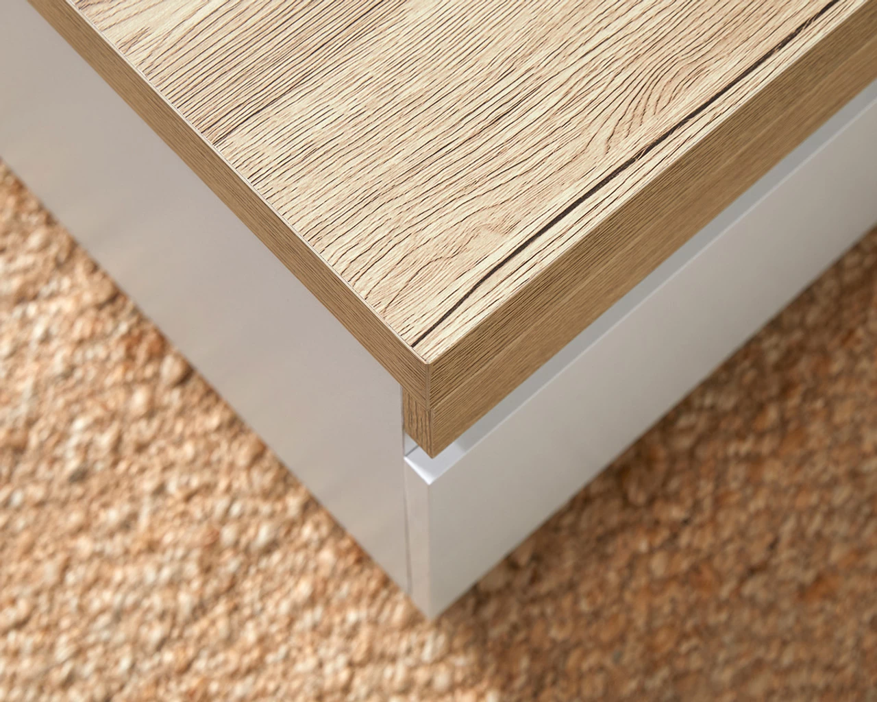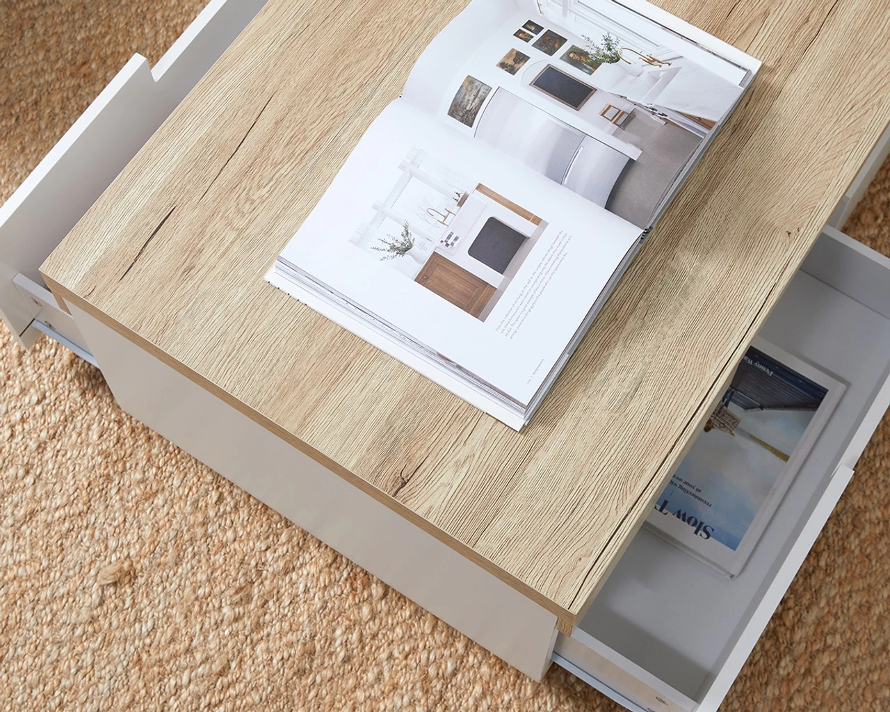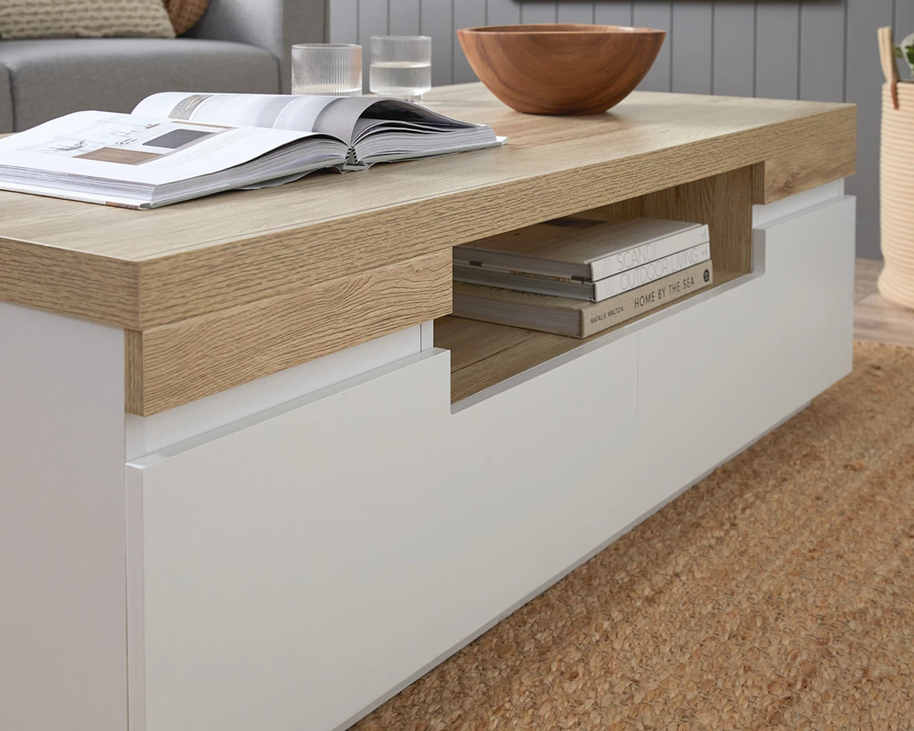 Invoking the uniquely Australian qualities of the elegant coastal trend, the Sadie Coffee table will refresh your living room with its understated, two-toned design. Pairing a modern outline, light wood-look top and crisp white body, it’s a great way to brighten any lounge room or media space. While on-trend, it’s also brilliantly functional with easy-slide drawers on both sides making it the perfect conversational centrepiece between your sofa and armchairs. The open recess in the centre is also the ideal spot to pop the remotes or style coffee table books, freeing up the space up top for décor and everyday use. Match back with the rest of the Sadie range for elegant coastal style throughout your home.