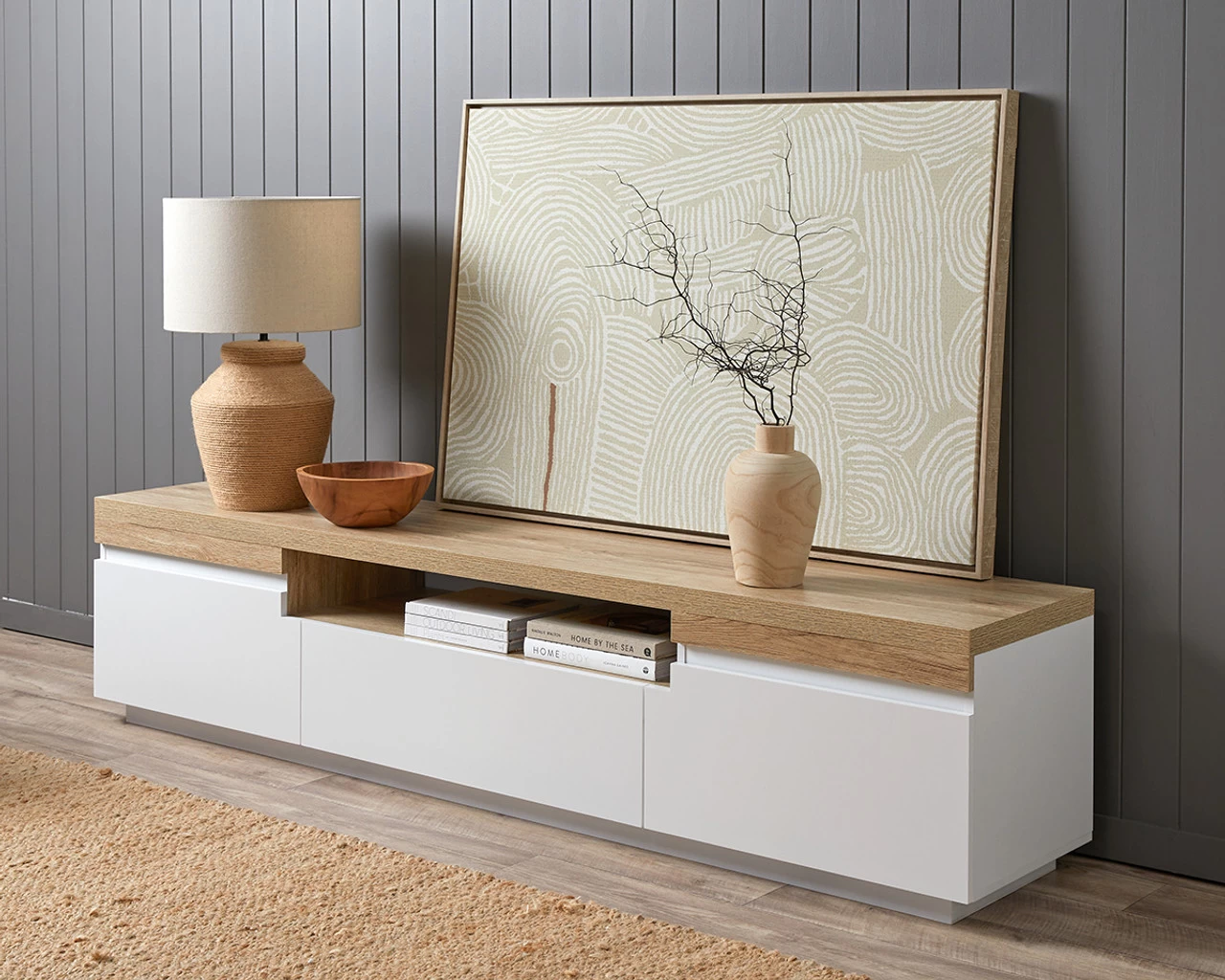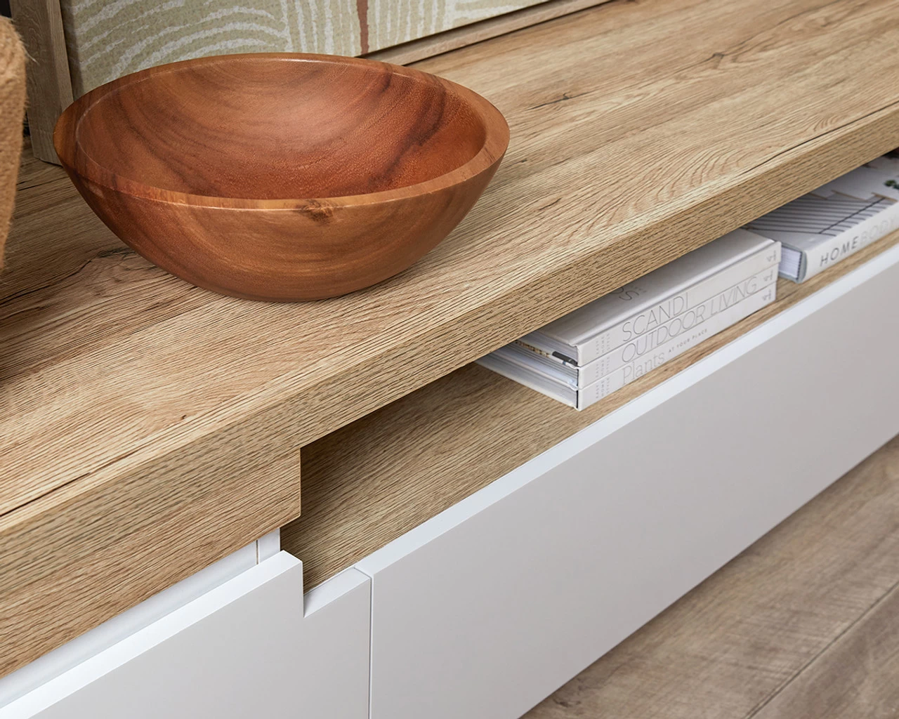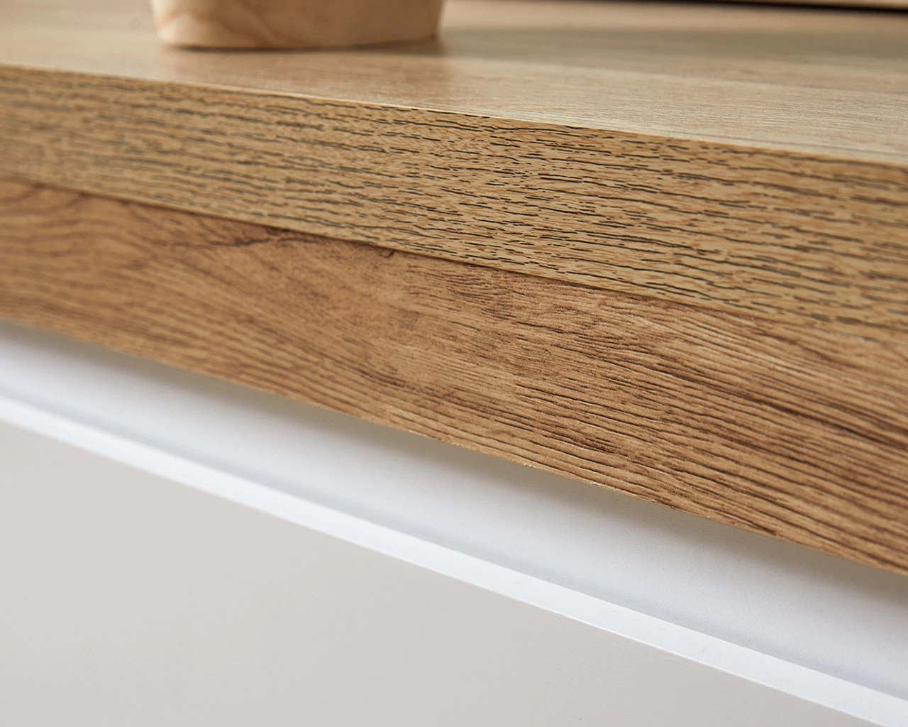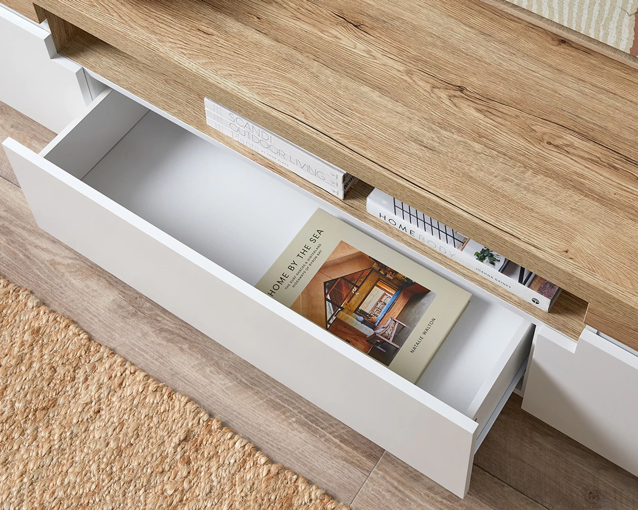 Give your living room an elegant coastal look with the understated two-toned Sadie Entertainment Unit – Large. It’s modern outline, light wood-look top and crisp white body will brighten and refresh your space. The perfect centrepiece in a living space or media room, it looks wonderfully stylish under a wall mounted TV. While on-trend, it’s also brilliantly functional with easy-slide drawers that open and close smoothly and quietly. The best part? The open recess in the centre where you can pop any utilities, freeing up the space up top for décor. Match back with the rest of the Sadie range for elegant coastal style throughout your home.