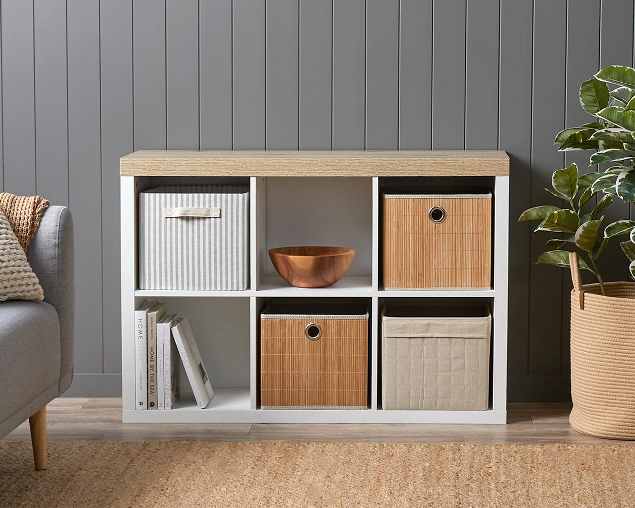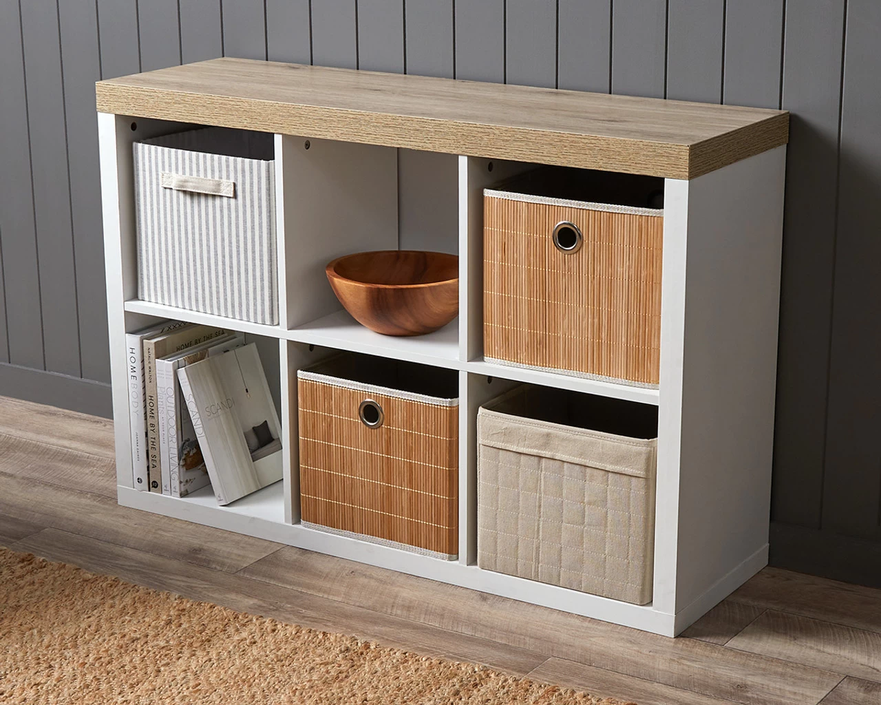 • Six cube shelves for display and basket storage