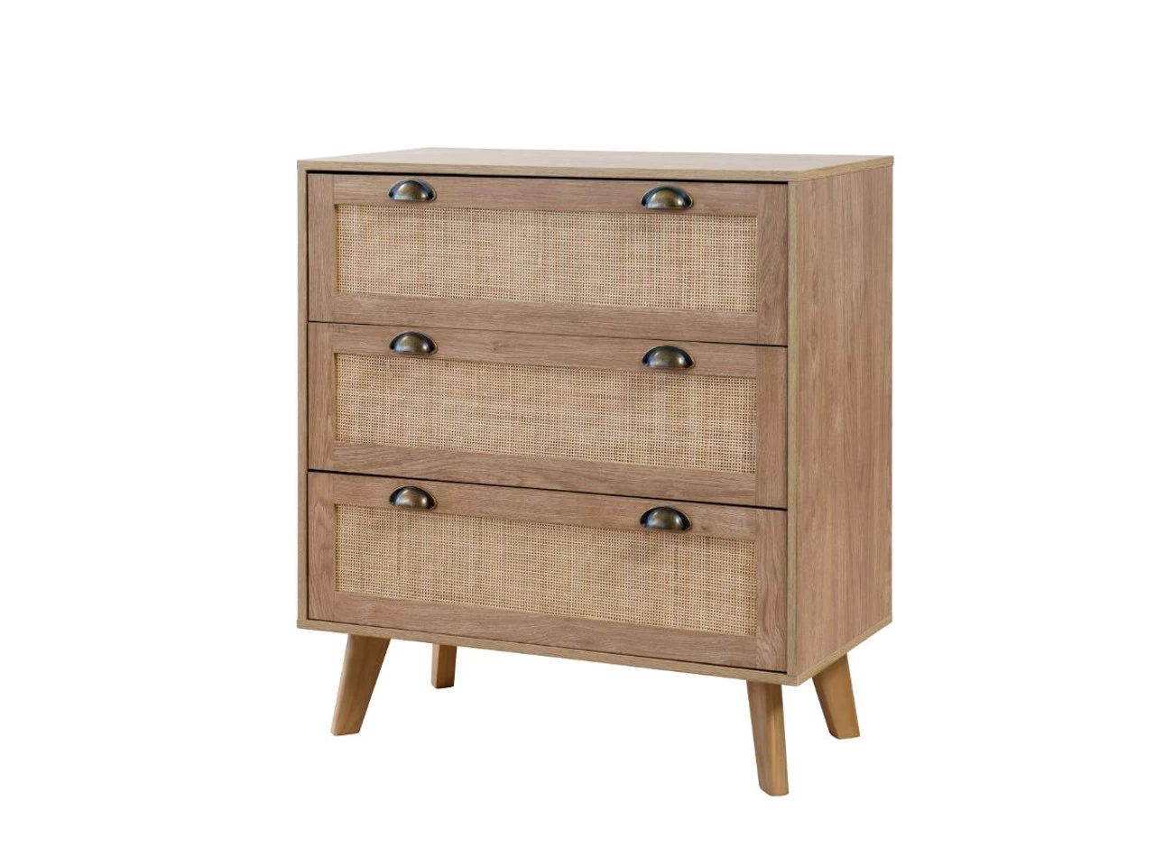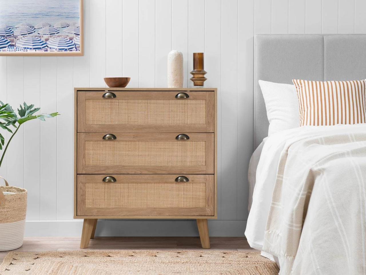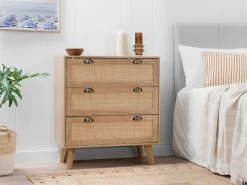 Create gorgeous statement style in your bedroom with the Savannah Three Drawer. Featuring three spacious, sliding drawers, you’ll be able to keep clothes and other bedroom essentials on hand but out of sight. This storage cabinet is perfect as a mid-sized dresser, chest of drawers or even as a larger bedside table. Offering a light and bright rattan and wood-look style, this rattan three drawer cabinet ensures any bedroom is gorgeously styled and organised.
