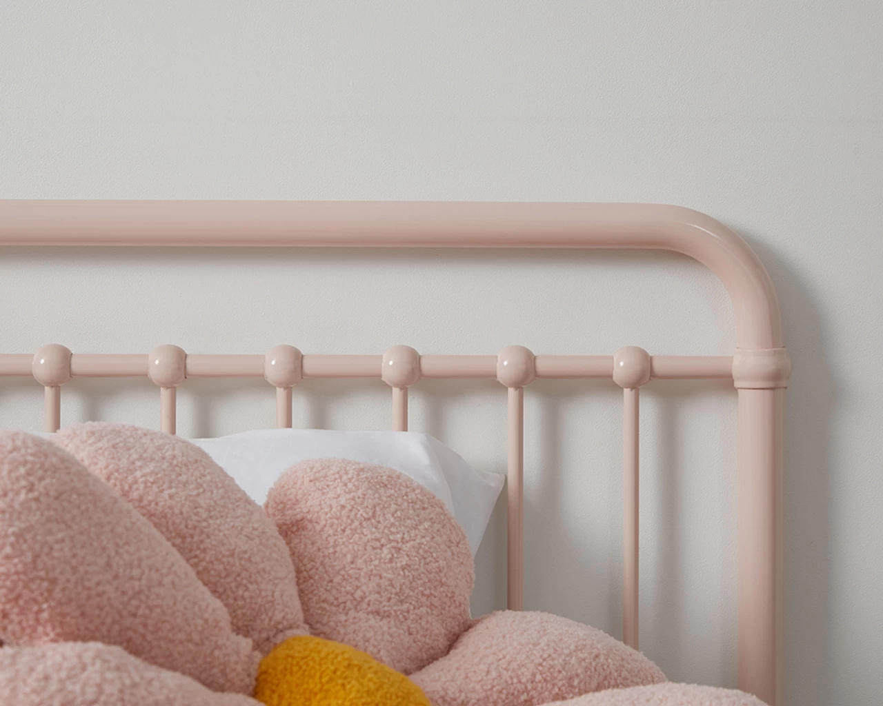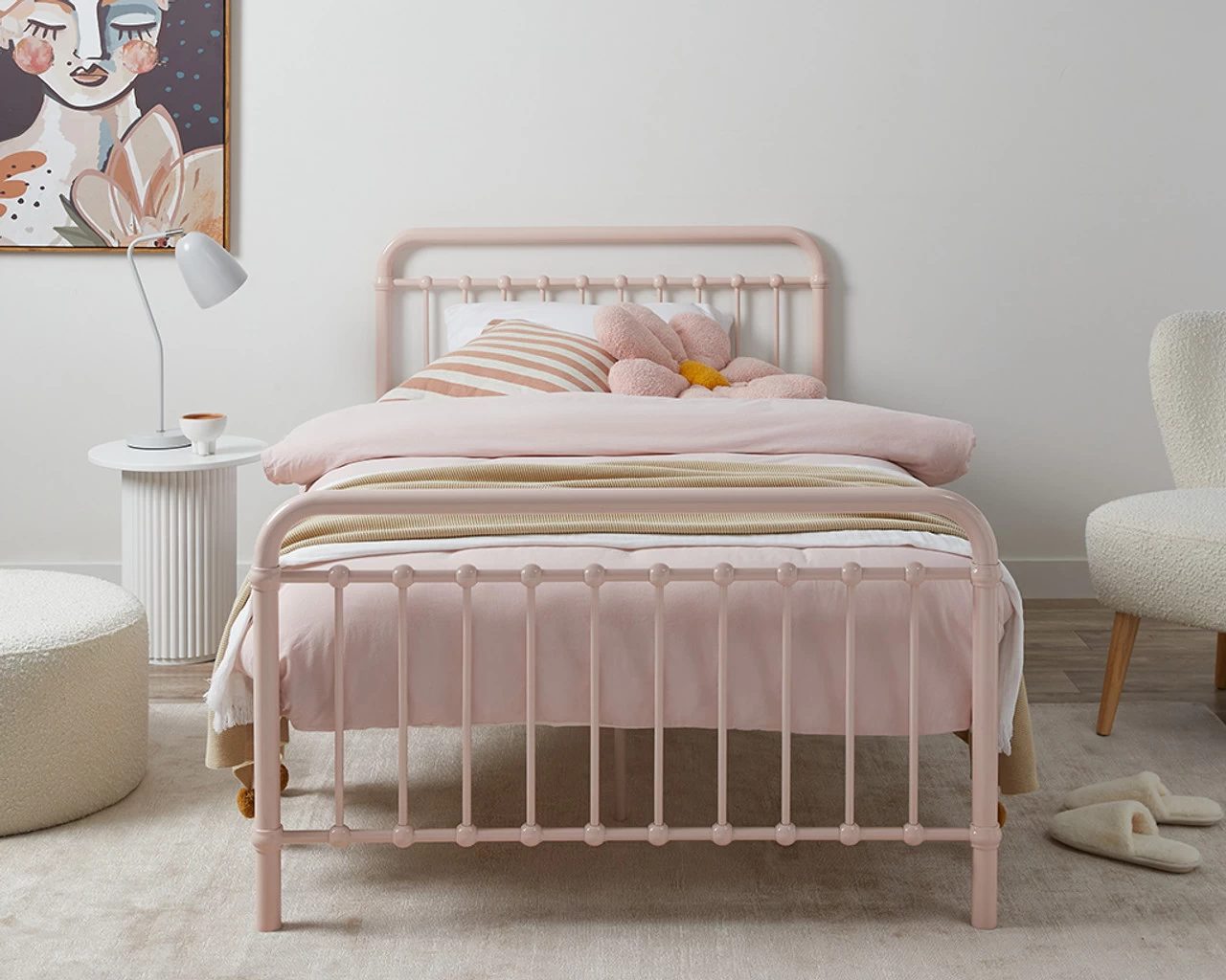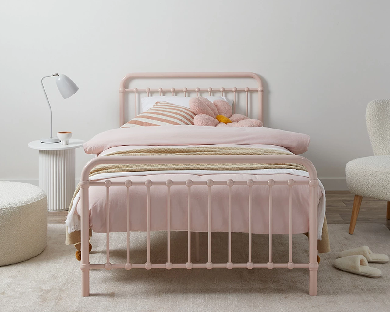 The Sonata Bed King Single – Pink is a larger kid’s or spare bed with a classic stylish look. Now in a new soft pink colourway, it is wonderfully on-trend and will add stylish colour to a kid’s bedroom or guest bedroom. With a sturdy metal frame and durable plywood slat base, it is comfortable and supportive for your child and guests to sleep. The curved headboard and metal detailing makes a statement and pairs beautifully with a range of bed linen and décor for a stylish bedroom space.
