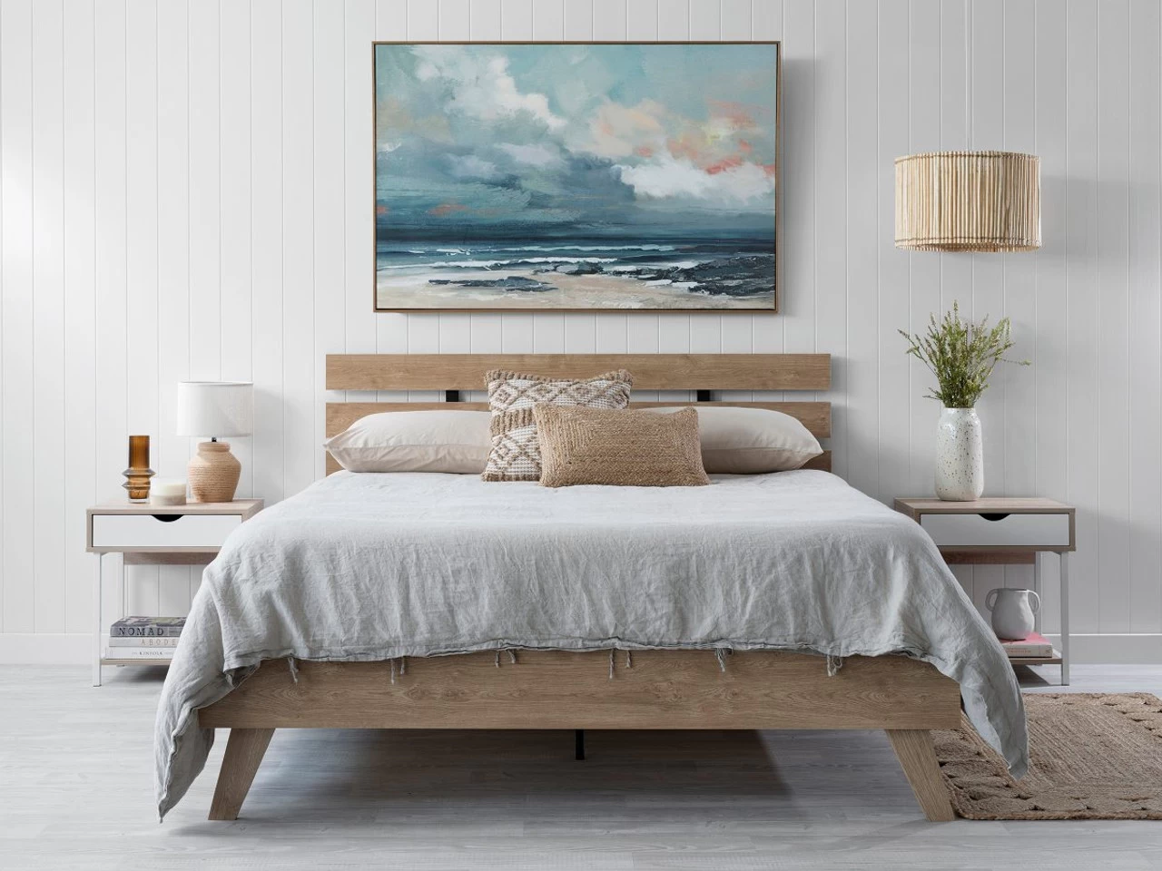 Create the ultimate bedroom with the Soren Queen Bed – Natural. Inspired by the simple and practical style of Scandinavian furniture, this queen bed has a sturdy and high-quality frame for a comfortable supportive base and helps you get a good night’s sleep. Invoking effortless style, this queen bed features an oak-look finish with a wood-look panel headboard that makes a statement in any bedroom. Pair with soft bedding and cushy pillows for an inviting bed you’ll be itching to cosy up in.