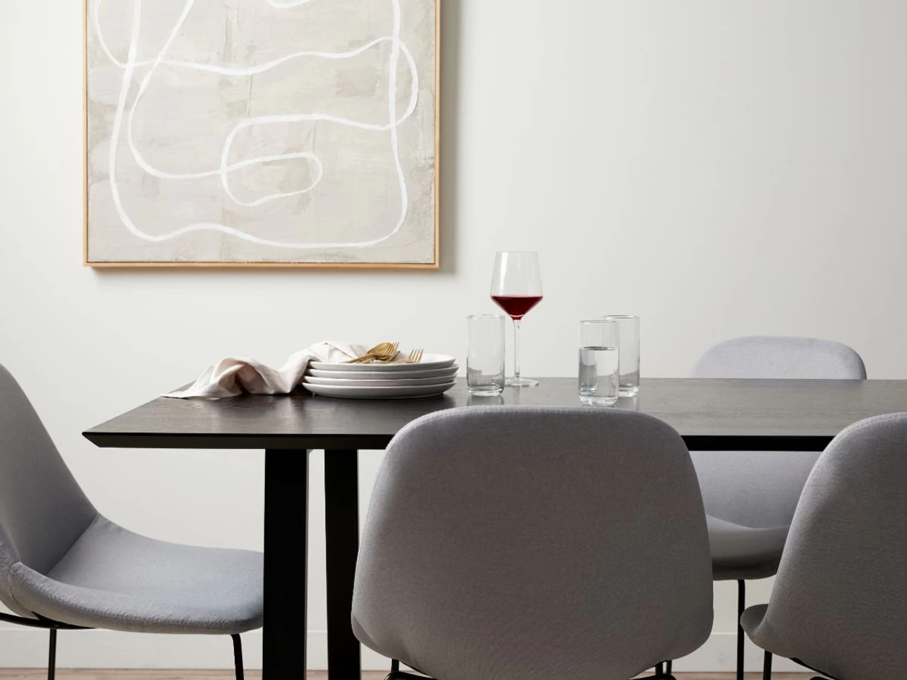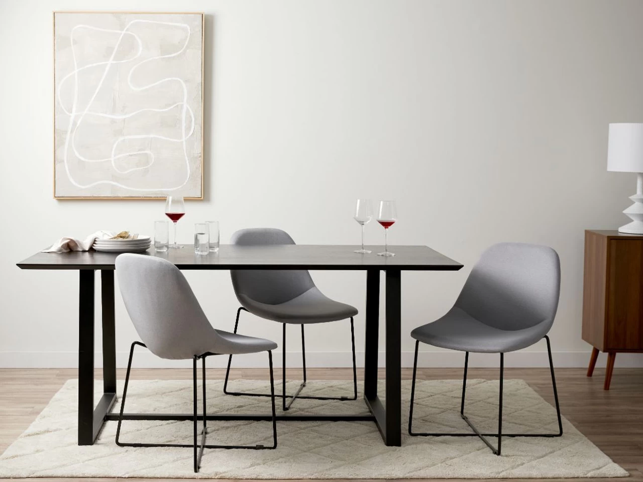 Giving you the best of both worlds, the legs are powder coated metal for structure and strength, while the timber veneer tabletop is perfect for durability. Creating an elegant silhouette in a room, this black dining table measures at 180cm for a spacious tabletop big enough for dining, along with all those activities that don’t include food – like poker night, homework and coffee catch-ups.