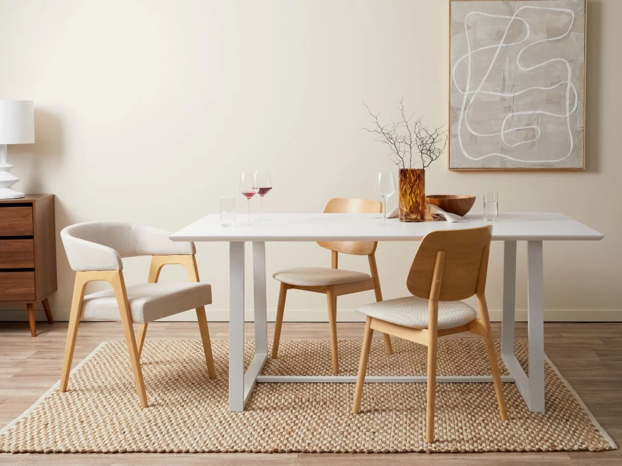 Giving you the best of both worlds, the legs are powder coated metal for structure and strength, while the wood veneer tabletop is perfect for durability. Creating an neutral, goes-with-everything base in a room, this white dining table measures at 180cm for a spacious tabletop big enough for dining, along with all those activities that don’t include food – like poker night, homework, and good conversations.