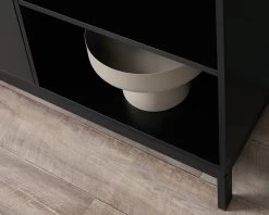 Give your home a sophisticated, modern look with the Zander Buffet – Black. Its sleek outline, woodgrain finish and bold, black colourway will add statement style to any dining room, office or living space. While modern and stylish, it’s also brilliantly functional with push to open doors that are easy to use and a variety of storage options. Display décor on the open shelves, and tuck everything else you’d rather keep out of sight in the cupboards. Perfect for serving dishes, extra vases, boardgames and more, you’ll love the versatile storage it adds in a room. Match back with the rest of the Zander range for a chic look throughout your home.