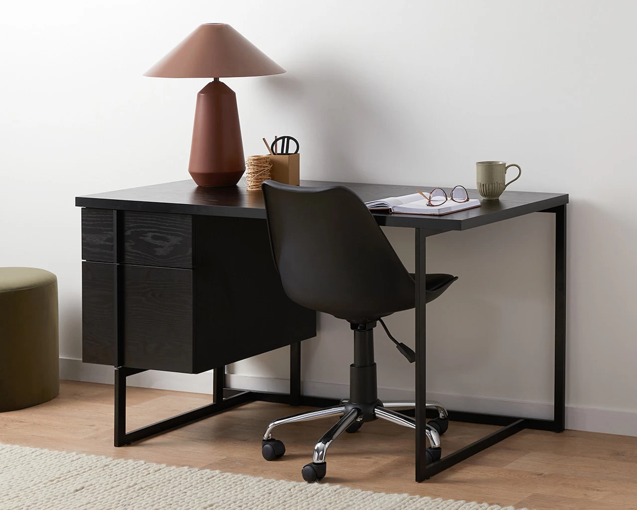 Elevate your home office with the Zander Desk – Black. Its sleek design, woodgrain finish and bold, black colourway will bring timeless, sophistication to any workspace. It has two sliding drawers, with the bottom drawer designed deeper for added storage space. Perfect for storing your paperwork, stationery, notebooks and even a secret stash of chocolate bars (we won’t tell!). With a generous length of 130cm, you’ll have plenty of room to spread out and work comfortably. Perfect for a home office or study nook, offering both style and practicality.