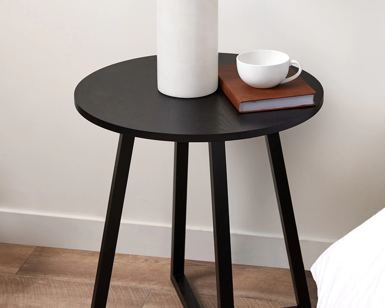 The Zander Round Side Table – Black is a modern, round end table with a sophisticated black colourway. Perfect for styling next to a couch, armchair, occasional chair or bed of any size, this black round side table is the perfect height to display a lamp or décor and will be a handy surface in a room to hold your book or cuppa. Featuring a chic, all black design this round end table is sophisticated and modern and will easily suit a range of decors such as urban, contemporary, minimalist and more.