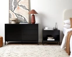 The Zander Six Drawer – Black adds sophisticated, modern style to your home. It’s sleek outline, woodgrain finish and bold, black colourway will add statement style to any bedroom or living space. While modern and stylish, it’s also brilliantly functional with six sliding drawers and ample surface space. Perfect as a dresser in the bedroom, you’ll have plenty of drawer storage for clothes, accessories and more. Style the surface with décor for a look you’ll truly love and match back with the Zander Bedside Tables for a statement look throughout your bedroom.