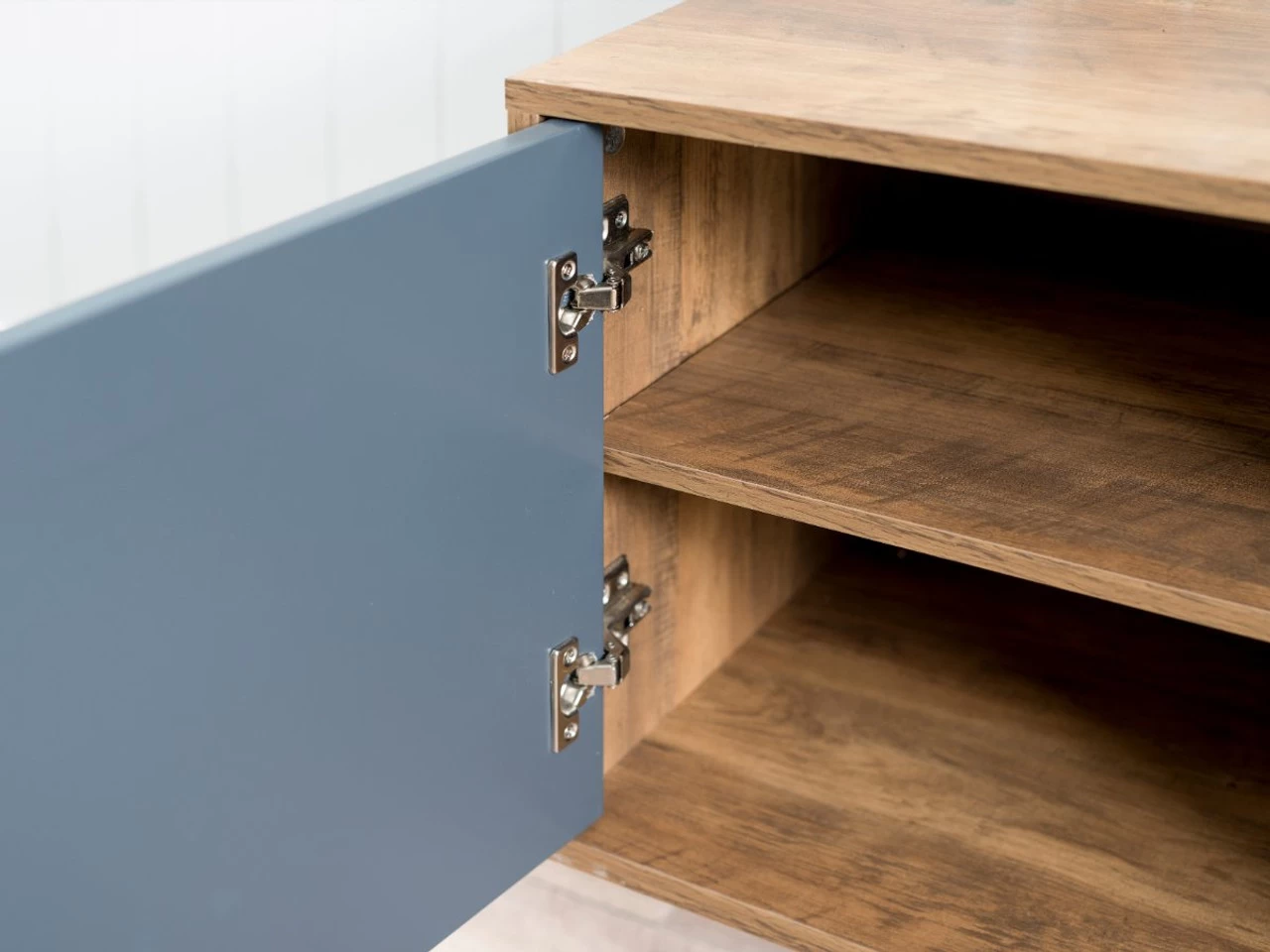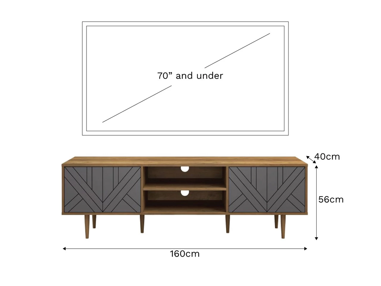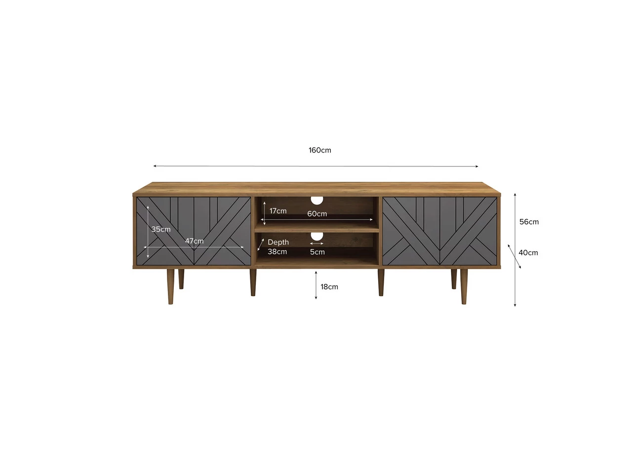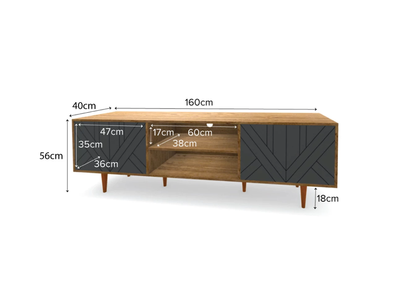 The elevated design also ensures it looks stunning when placed under a wall-mounted TV and provides ample space for styling. The two cupboards each contain a single shelf with 3 adjustable heights, so you have the flexibility to change the space inside to match your storage needs!