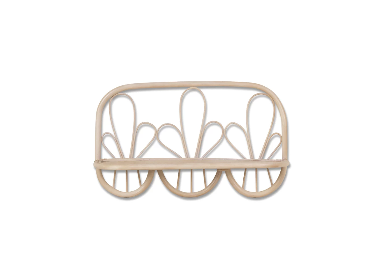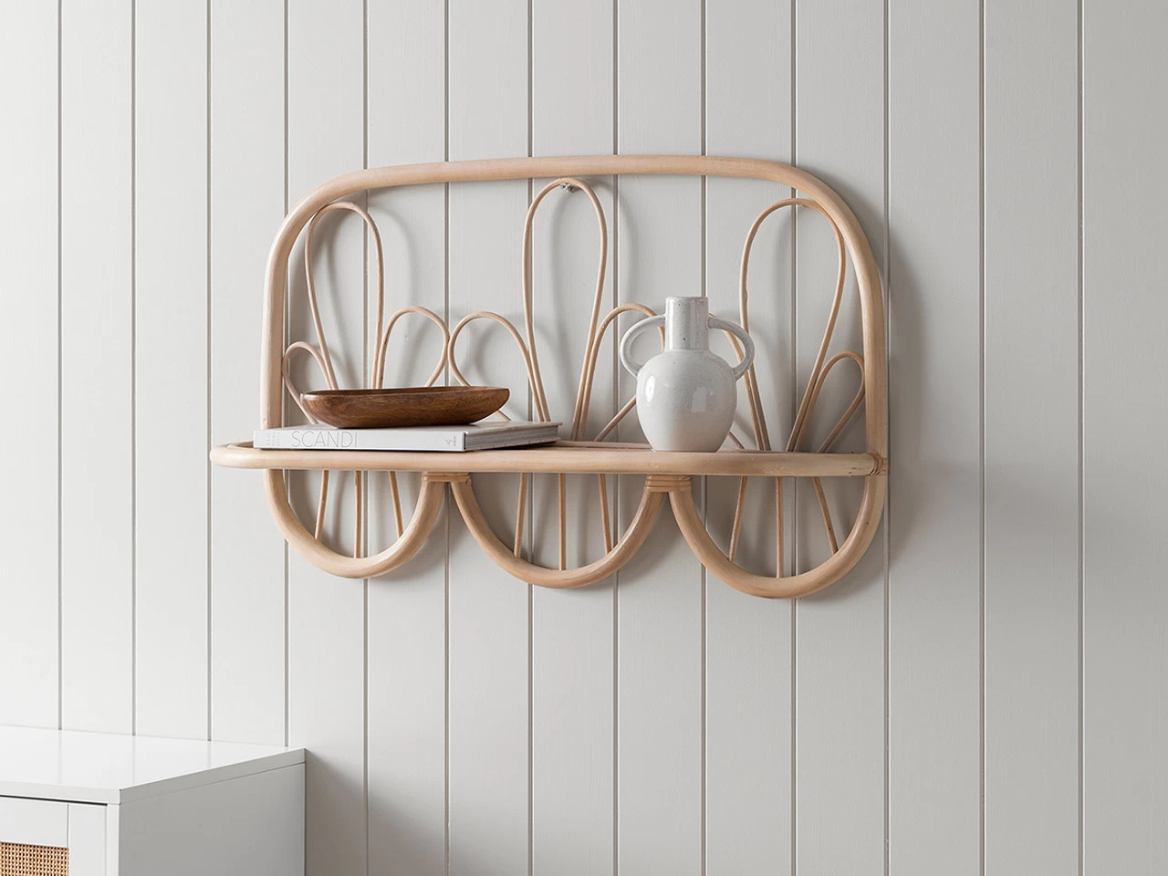 The Ziggy Rattan Wall Shelf Ledge is a striking, unique floating shelf with a decorative, peacock feather design. Made from rattan, this single floating shelf hangs flush against a wall and is a great way to add a stylish shelving option to a room. With a distinct bohemian design, this rattan floating shelf adds pattern and natural texture into a space. Providing a handy shelf for styling lightweight décor, books, photos, plants, and essentials, you’ll love this rattan wall shelf above a console table, in a hallway, powder room or living space.