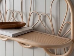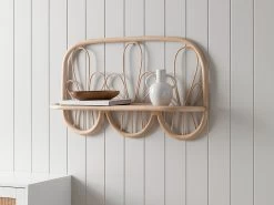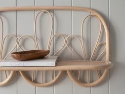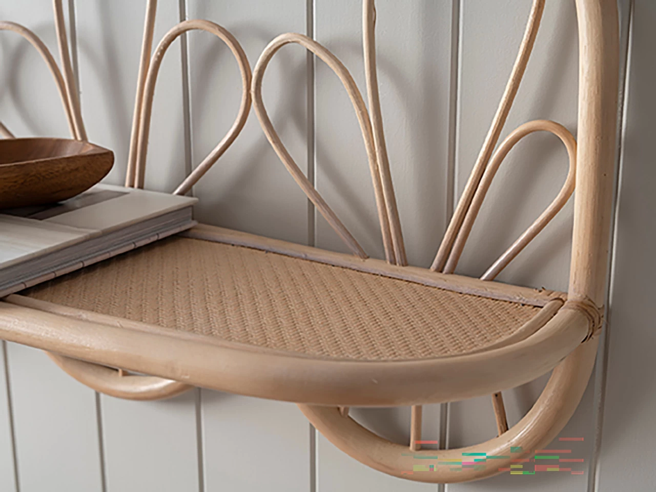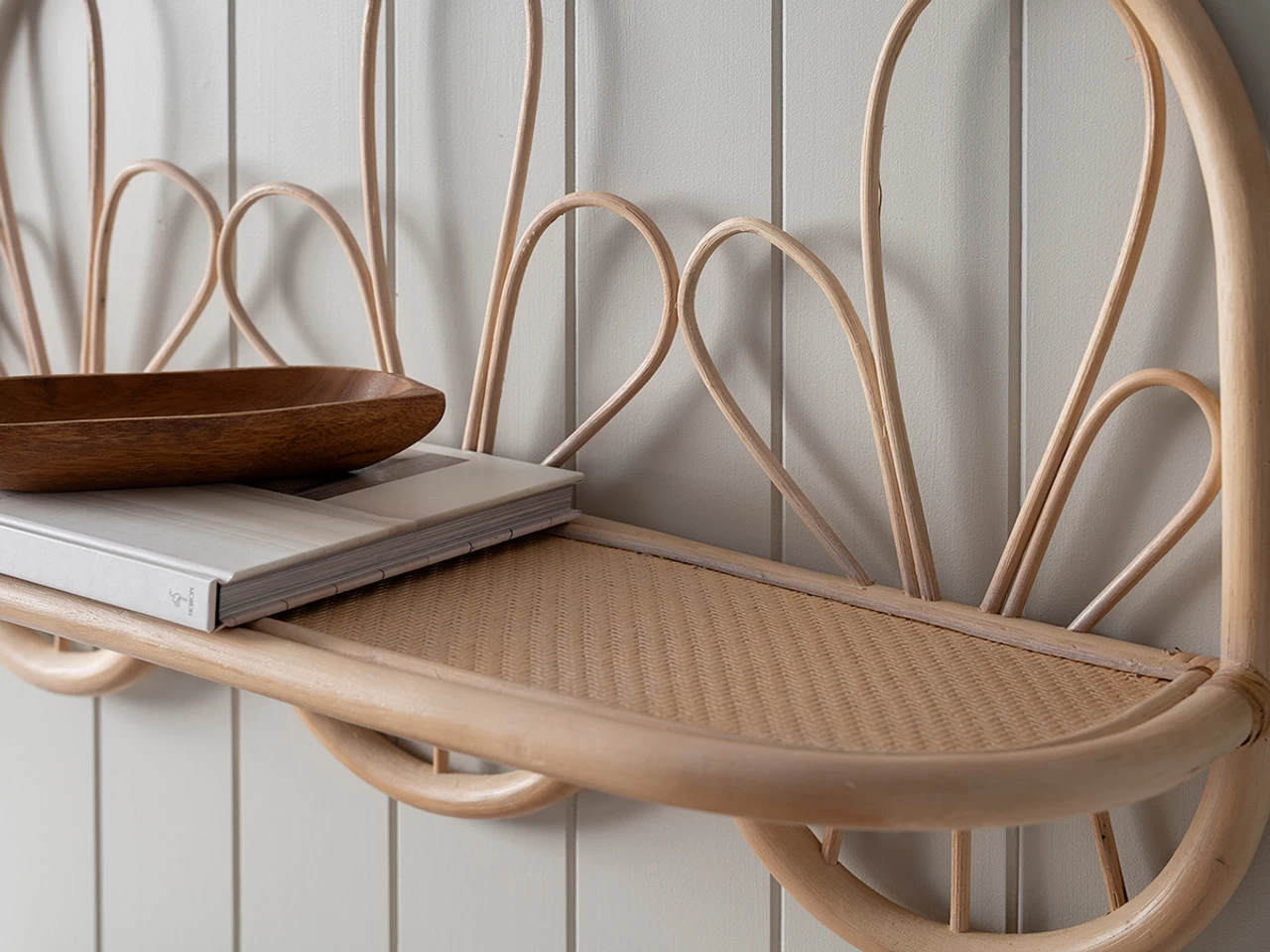 The Ziggy Rattan Wall Shelf Ledge is a striking, unique floating shelf with a decorative, peacock feather design. Made from rattan, this single floating shelf hangs flush against a wall and is a great way to add a stylish shelving option to a room.